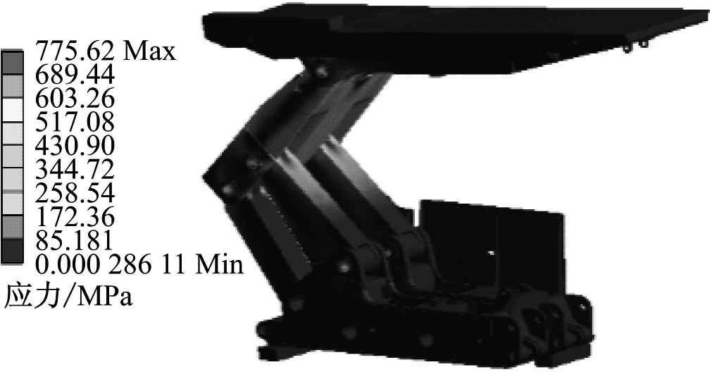 分别在顶梁偏载与底座扭转、顶梁扭转与底座集中载荷、顶梁集中载荷与底座偏载3种工况下对大采高垛式液压支架进行模拟加载试验[13-15],得到支架在3种工况下的应力云图和变形云图,分别如图2—图4所示。