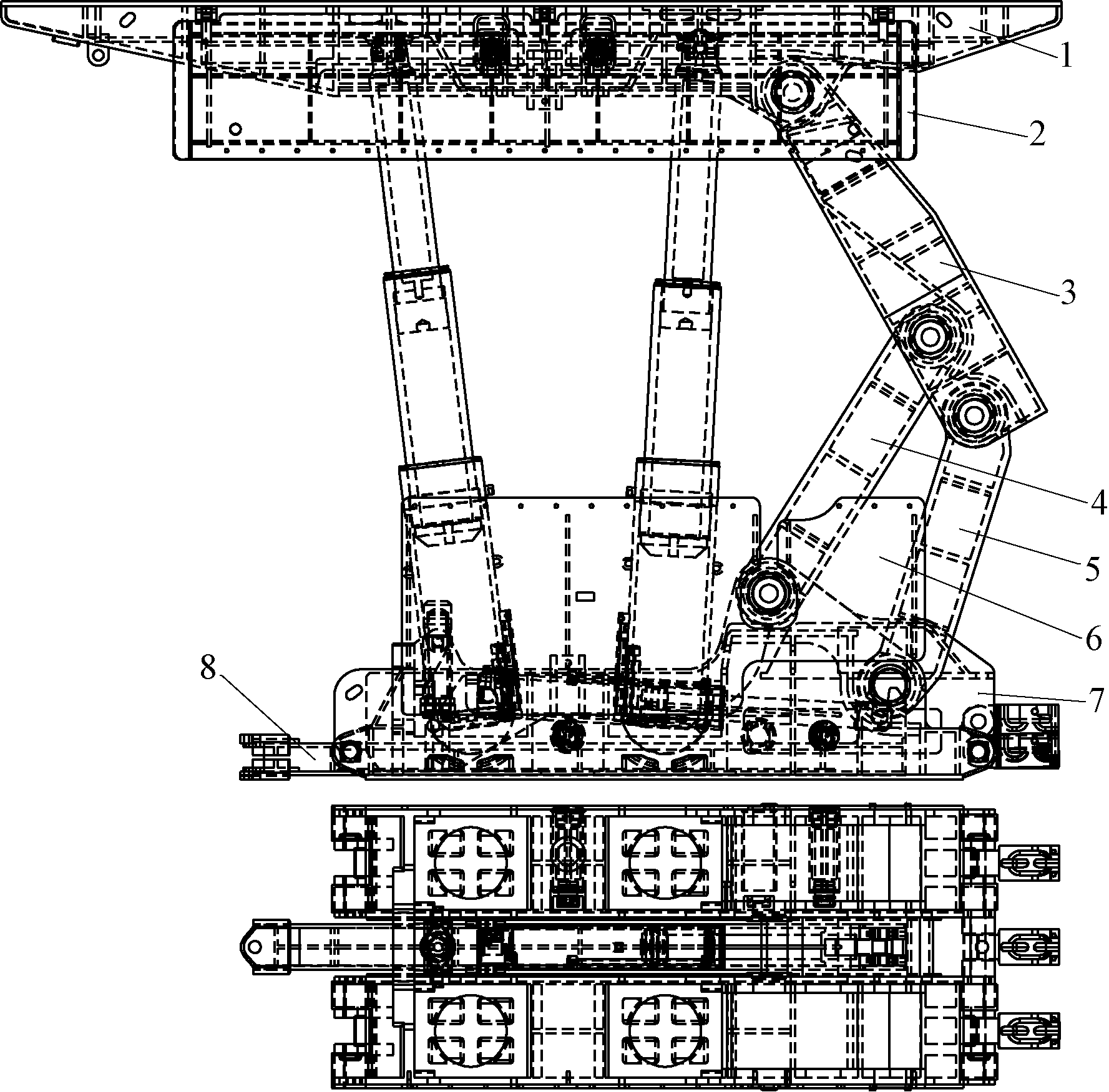 1—顶梁;2—顶梁侧挡板;3—掩护梁;4—前连杆;5—后连杆;6—底座固定挡板;7—底座;8—长推杆