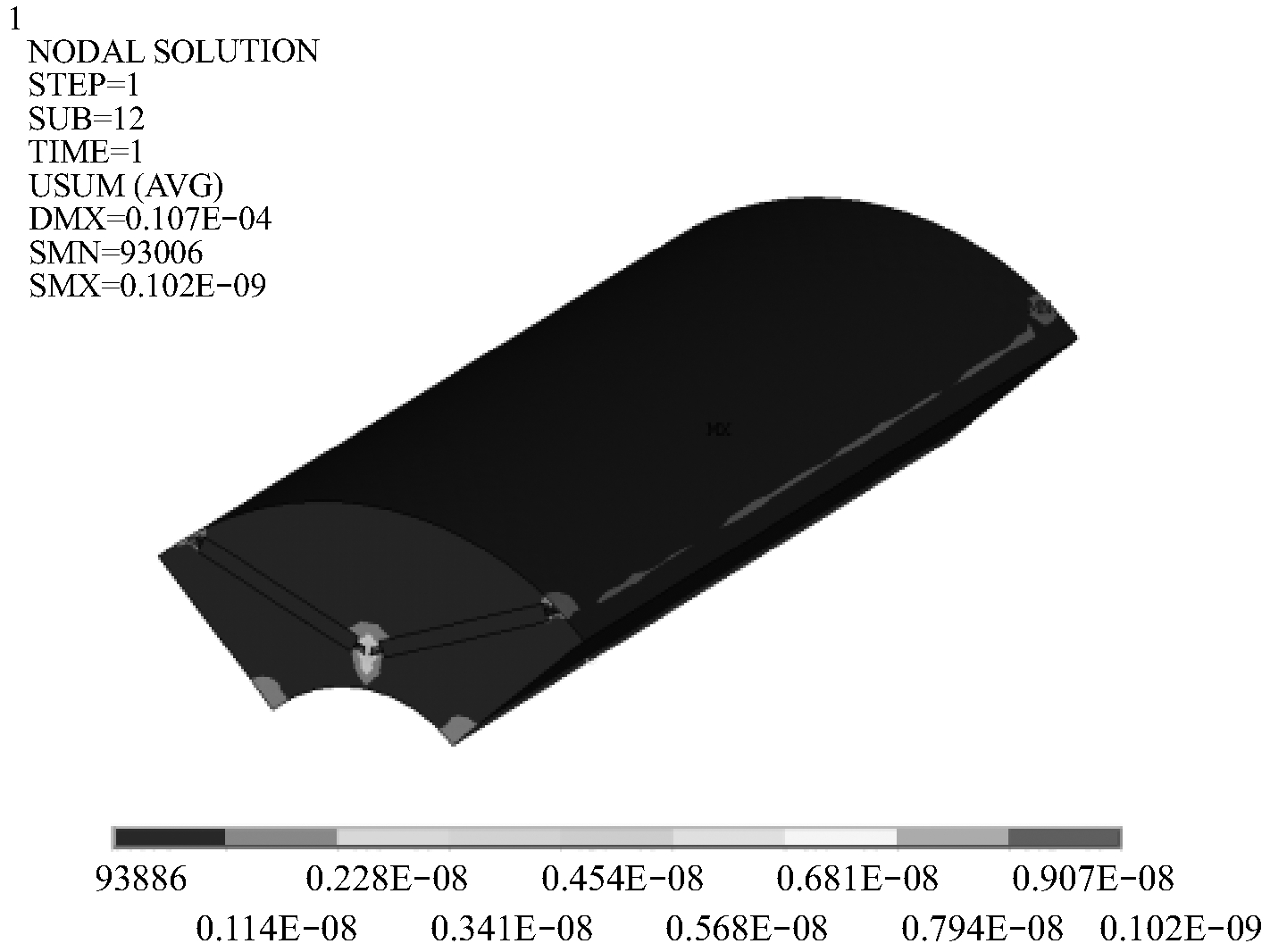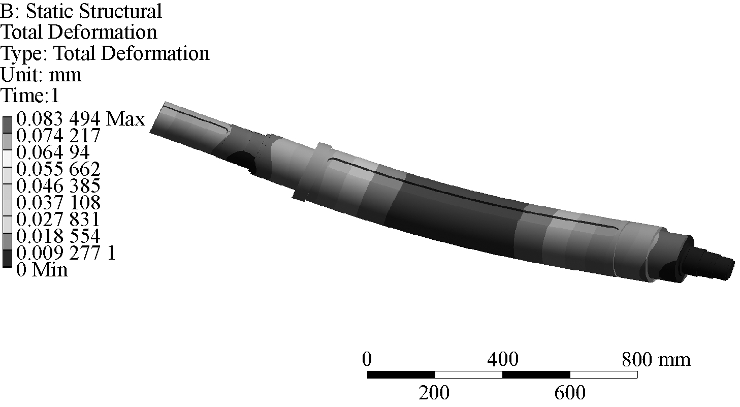 通过ANSYS Workbench的静力计算得到轴的挠度云图,如图5所示。可见,轴的最大挠度为0.083 mm,在合理范围内。