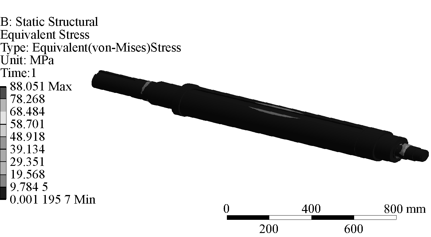 轴的强度云图如图6所示,从图6可看出,轴的应力集中发生在与轴承接触部位的两侧凹槽处,轴的最大应力为88.051 MPa,远小于合金结构钢35CrMo的屈服强度835 MPa,符合轴的强度要求。