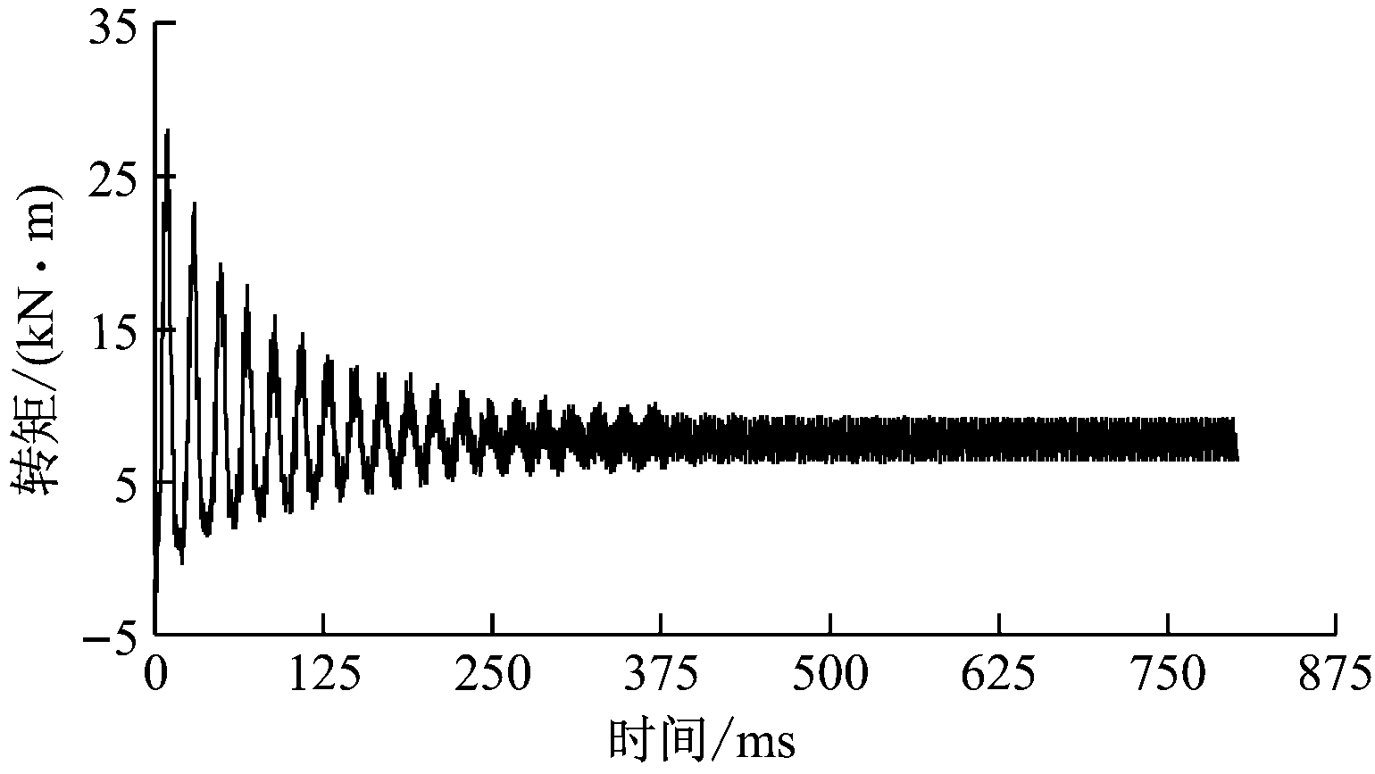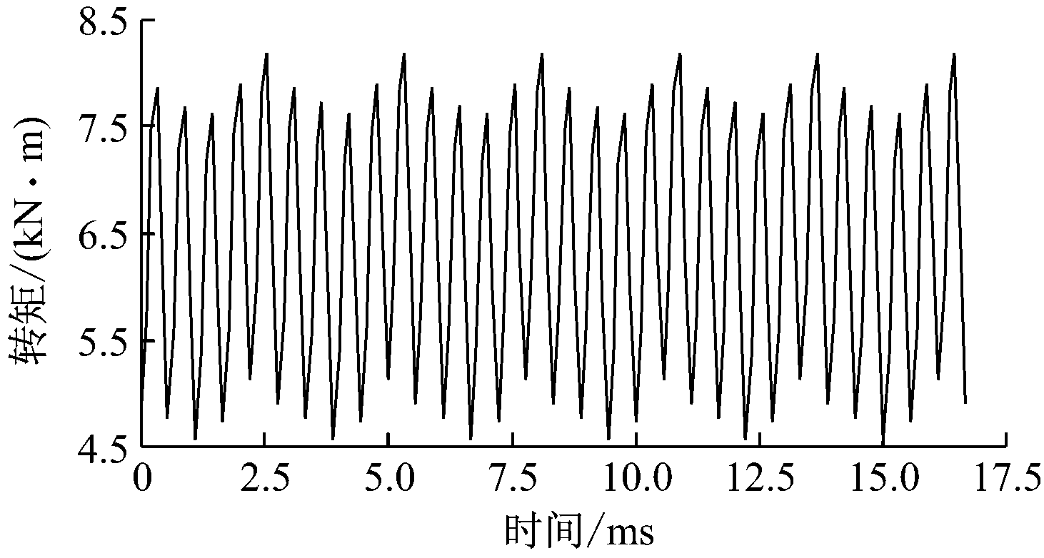 加载相电压幅值为2 400 V的正弦电压源,仿真得到内功率因数角为55°时的转矩波形,如图2所示,平均转矩约为7.841 kN·m。