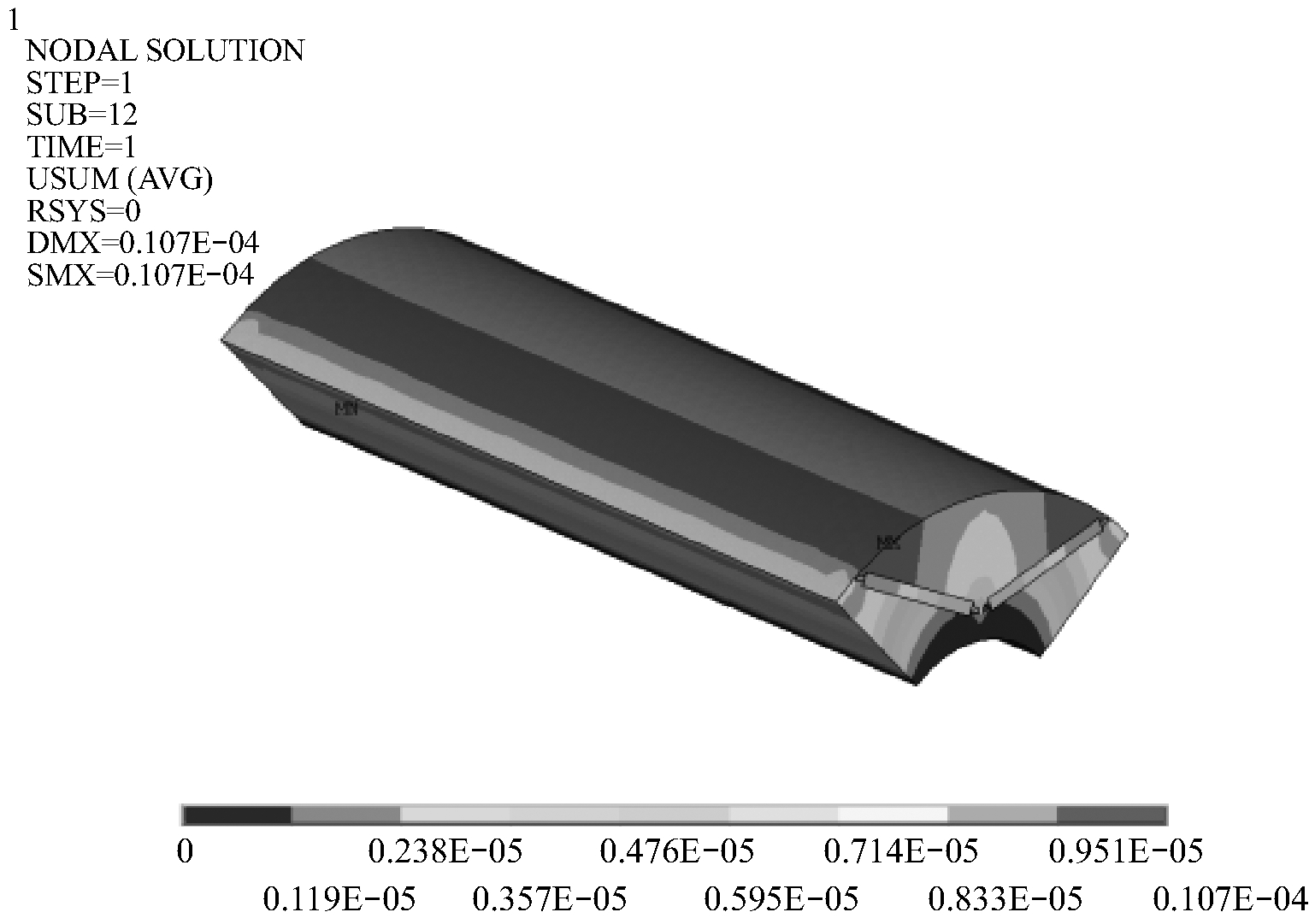 考虑重力、角速度产生的离心力影响,铁芯内圈全固定约束,2个端部轴向方向约束,进行有限元静力分析。合位移云图如图7所示。可见,最大等效合位移为0.107×10-4m,发生在转子铁芯外圈靠近磁钢处。