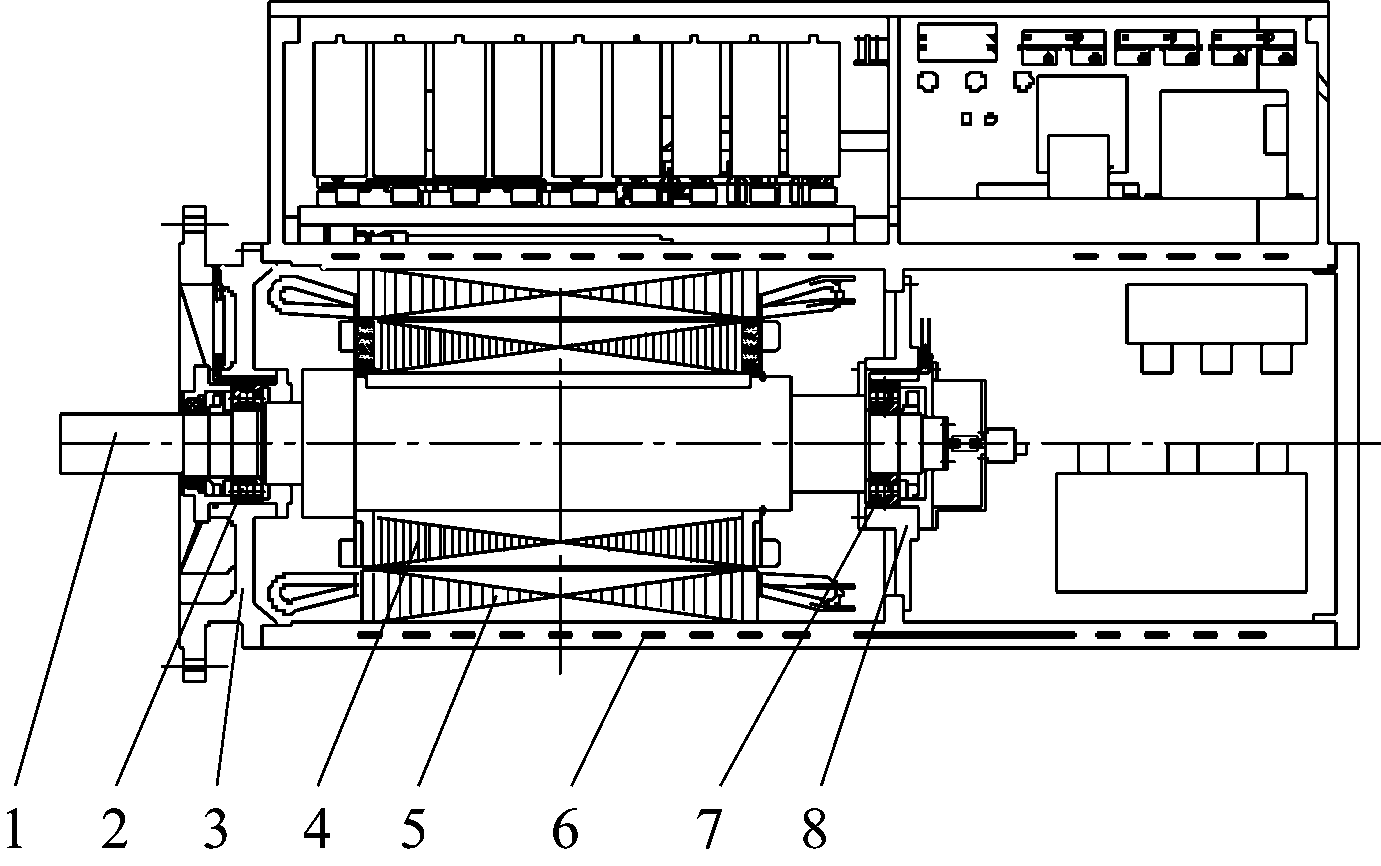 1—轴; 2—圆柱滚子轴承; 3—驱动端端盖; 4—转子; 5—定子;6—螺旋冷却水道; 7—深沟球轴承; 8—非驱动端端盖