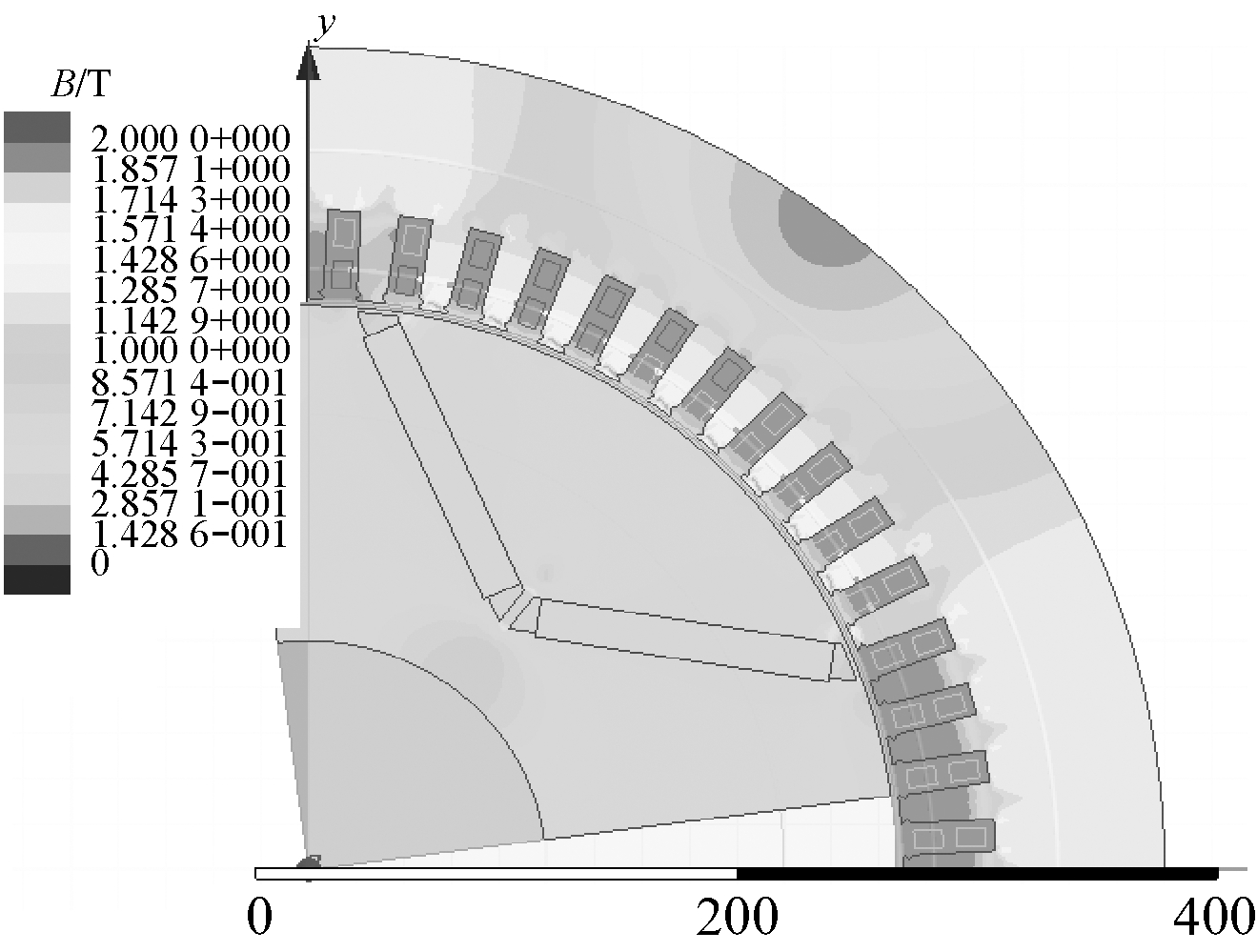 变频一体化永磁同步电动机的转子结构形式多种多样,为了适应电动机弱磁调速1.8倍的要求,转子磁极采用V形磁极结构,取1/4部分转子铁芯及1对内嵌磁钢作为模型,使用有限元进行校核[14-15]。