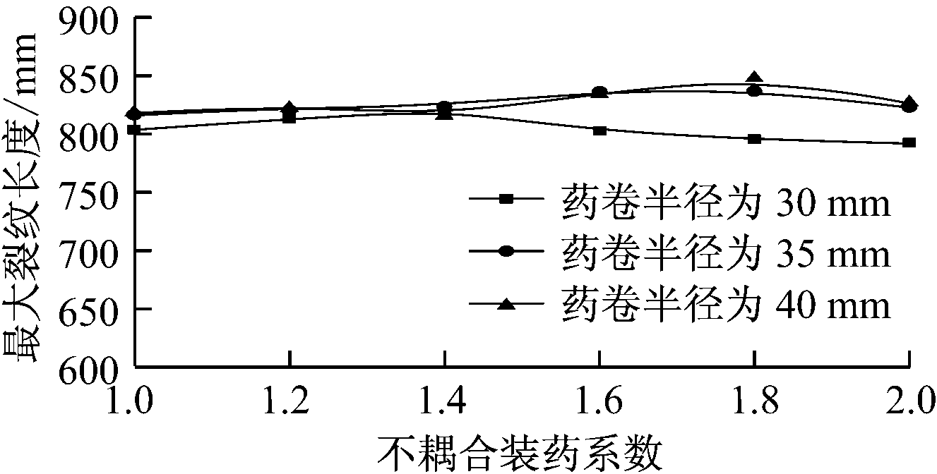 不耦合装药系数为1~2时,3种药卷半径下,最大裂纹长度均在800~850 mm内,变化不明显,说明不耦合装药系数、药卷半径对裂隙区范围的影响不明显。总体看来,随着不耦合装药系数的增大,最大裂纹长度也渐渐增大,达到一个峰值后就开始减小。当药卷半径为35,40 mm时,不耦合装药系数约为1.8时,最大裂纹长度达到最大值;当药卷半径为30 mm时,在不耦合装药系数约为1.5时,最大裂纹长度达到最大。