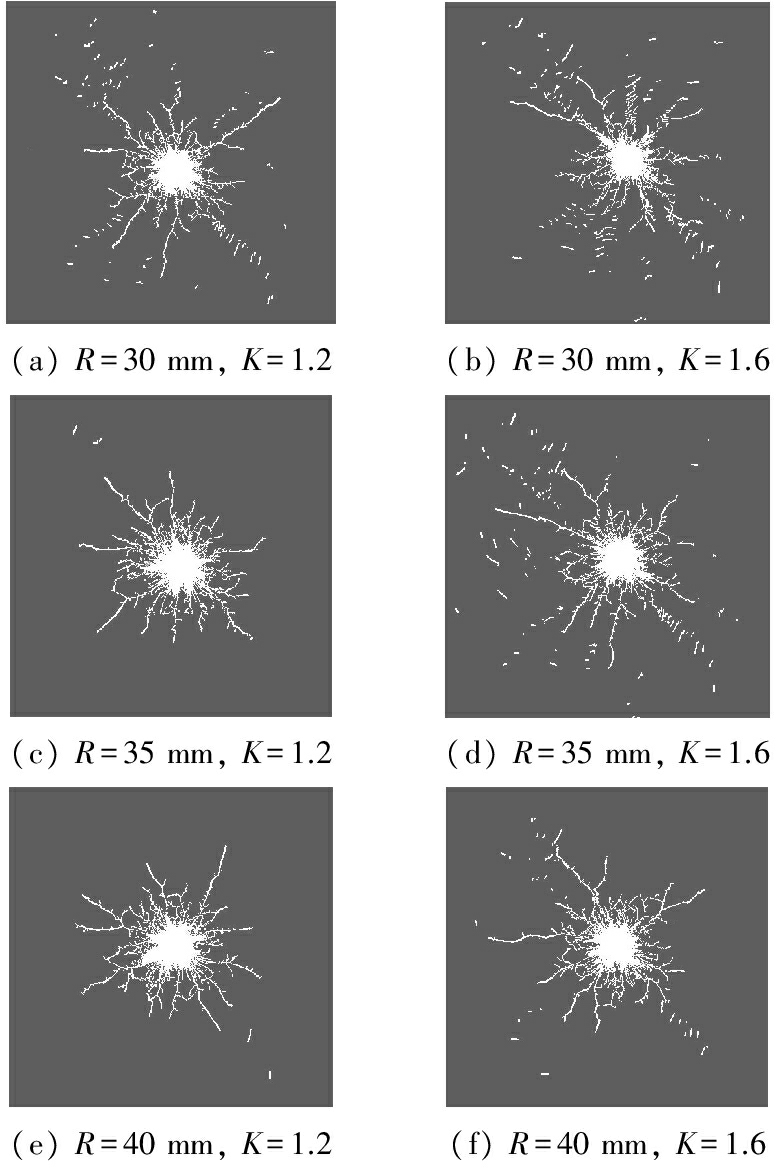 根据文献[11-12],煤矿深孔爆破钻孔的最佳直径范围为75~95 mm,进行爆破致裂时药卷半径一般为30~40 mm。为了确定适用于所研究煤体的药卷半径及不耦合装药系数,设置药卷半径R分别为30,35,40 mm,不耦合装药系数K为1~2,用计算模型进行爆破致裂模拟,模型设置为无反射边界条件。起爆后1 500 μs的部分典型爆破致裂结果如图2所示。