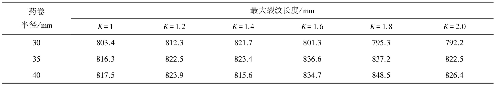 Table 5 Maximum crack length under different cartridge radius and non-coupling charging coefficient