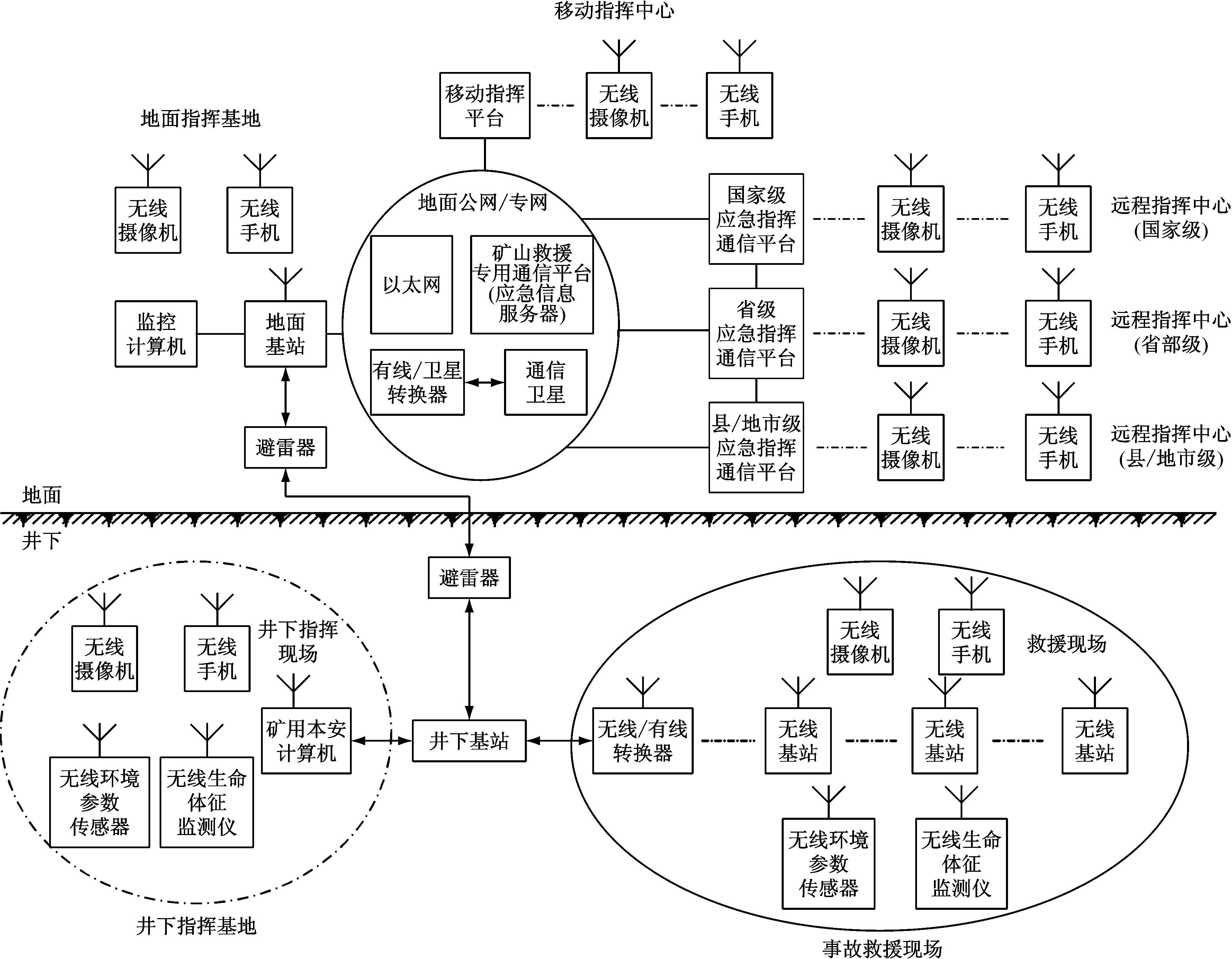 (3) 地面指挥基地系统(地面抢险指挥部)。包括信息采集与传输显示设备、基于公网/专网的有线、无线和卫星通信设备、数据存储、分析设备、企业级应急指挥平台等,主要实现事故救援现场子系统和井下指挥基地子系统的数据汇总,属地管理为主的综合决策指挥,与井下指挥基地子系统、远程指挥中心、专家辅助决策指挥系统和救援人员与物资调度系统联动。