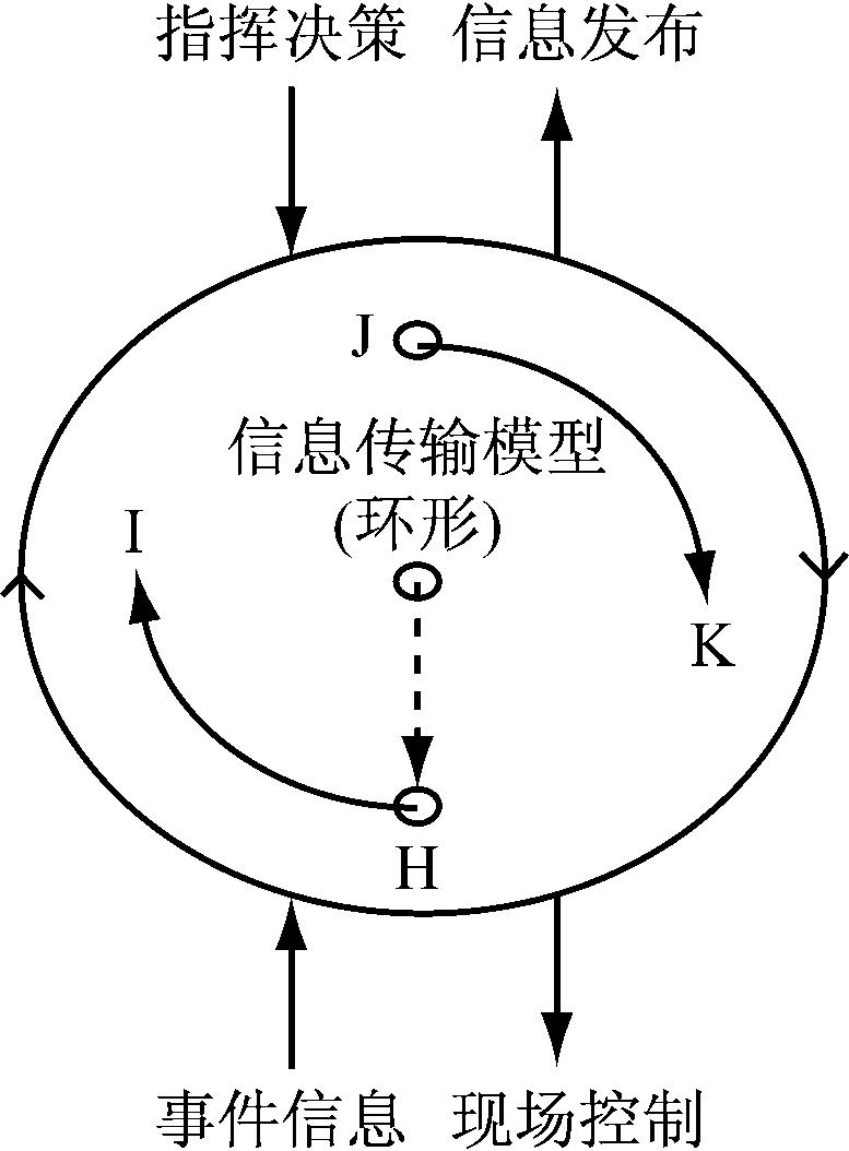 矿山应急指挥环形信息传递模型的简化模型如图5所示。应急信息环流分为4个阶段:起始阶段(H时间段,事件信息)—事件发生发展阶段(I时间段)—应急决策与信息处置阶段(J时间段,指挥决策,信息发布)—现场处置阶段(H时间段,现场控制),结束。