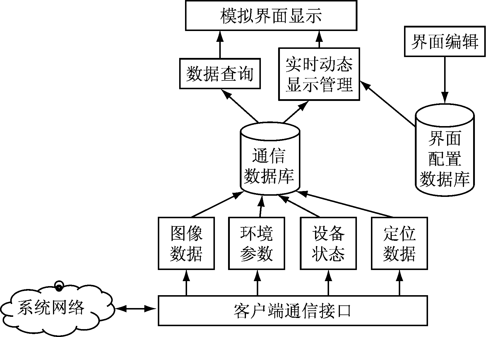 客户端应用软件工作流程如图3所示。客户端应用软件运行于各应急指挥平台终端,为用户提供可视化人机交互界面,从服务器端获取各类应急救援指挥信息并进行显示。客户端应用软件交互部分由界面编辑模块和模拟界面显示模块2个部分组成。界面编辑模块组织生成各指挥平台用户感兴趣的数据显示内容,将配置信息存储于配置数据库,客户端每次启动后从配置数据库中读取数据。模拟界面显示模块以界面配置信息数据为依据,可显示各类查询数据和实时动态数据。客户端应用软件通过客户端通信接口从指挥信息数据库中获取各类数据,数据缓存于客户端通信数据库中,界面显示模块从数据库提取数据并进行显示。