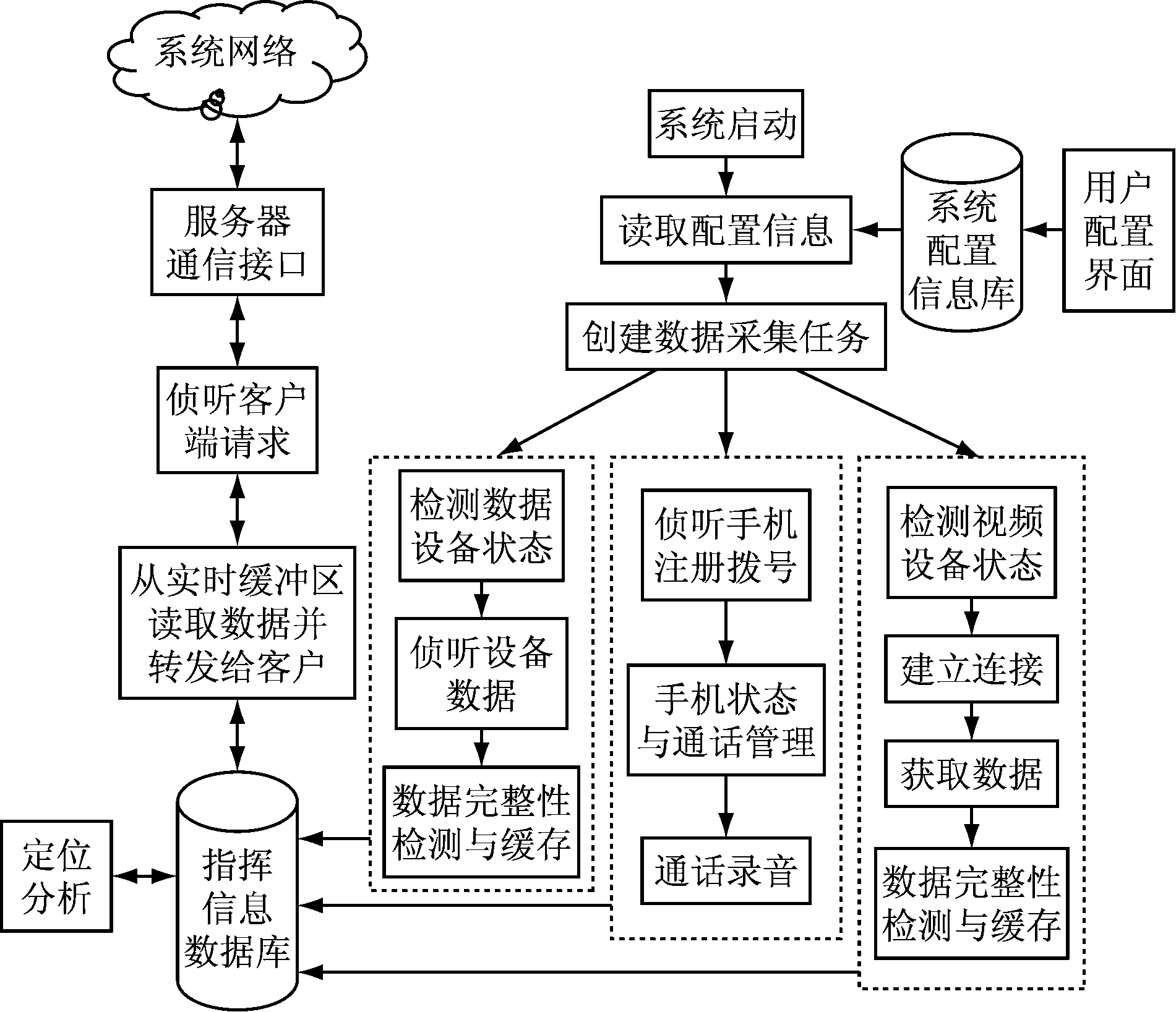 服务器信息处理软件工作流程如图2所示。服务器软件模块用于维护系统网络,将各子系统平台统一管理,与终端应用设备进行直接数据交流,实现指挥信息的传递与存储管理,包括一个系统配置信息库和一个指挥信息数据库。系统配置信息库存储各子系统的设备配置信息,服务器启动后读出相关数据,创建服务器数据采集任务,进行设备状态检测、手机注册拨号及通话管理,获取视频数据,生成一系列指挥信息,存储于指挥信息数据库中。服务器设计有一个通信接口,该接口实现与系统网络各类设备的通信,客户端通过该接口从指挥信息数据库中获取各类数据。