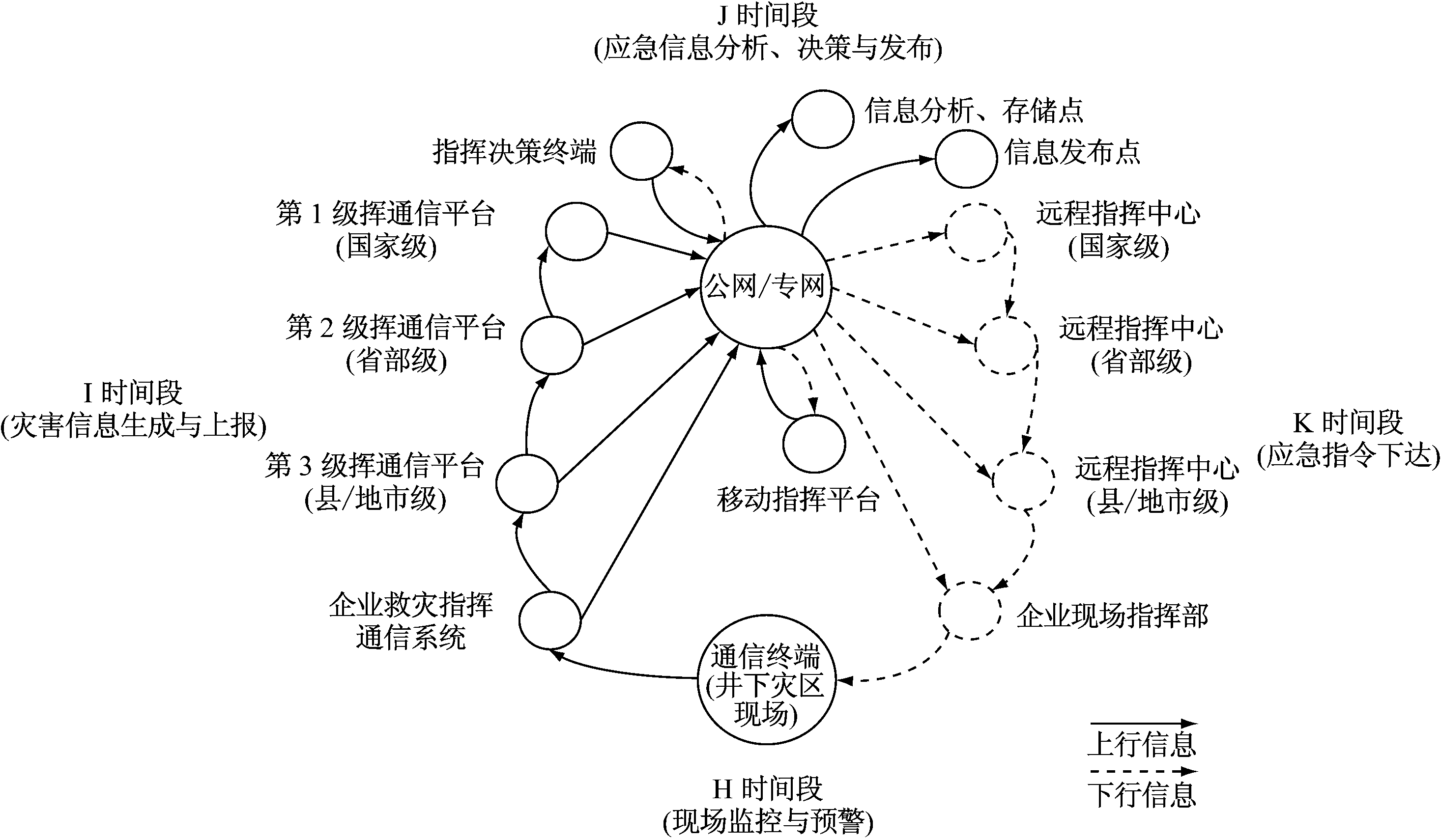 K时间段:应急执行指令下达阶段。应急指令通过远程指挥中心(国家)、远程指挥中心(省部级)、远程指挥中心(县/地市级)、企业现场指挥部,最终由通信终端接收,形成一个闭环信息传递系统。