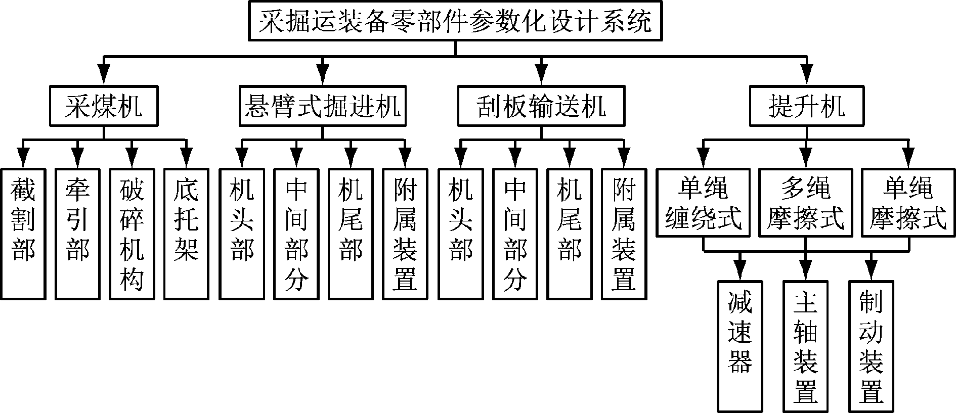 基于Web的采掘运装备零部件参数化设计系统针对采煤机、悬臂式掘进机、刮板输送机、提升机的零部件进行参数化设计,系统框架如图3所示。