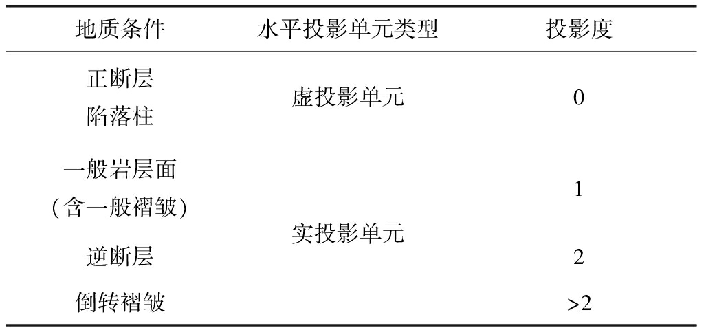 考虑到岩层面在三维建模时一般采用水平面作为其正投影平面,因此,根据定义,并通过分析可得不同地质条件下岩层面水平投影单元特征(表1)。