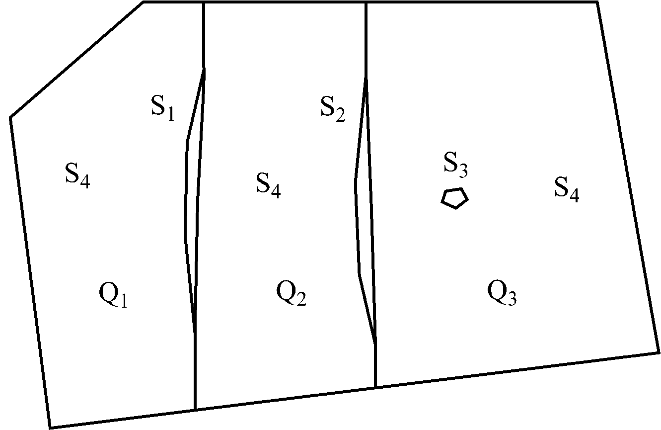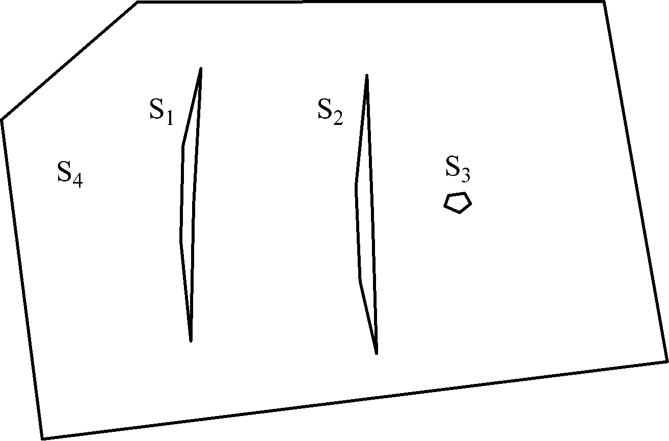 某矿井煤层底板等值线图如图1所示,其中F1为正断层、F2为逆断层,且存在一个陷落柱。根据表1,将正断层F1上下断煤交线之间断层面对应的水平投影区域划分为水平投影单元S1;将逆断层F2上下断煤交线之间的两层重叠岩层面的水平投影区域划分为水平投影单元S2;将陷落柱的水平投影区域划分为水平投影单元S3;将其他岩层面(含一般褶皱)的水平投影区域划分为水平投影单元S4。水平投影单元分布如图2所示。不同地质条件下水平投影单元及投影度见表2。