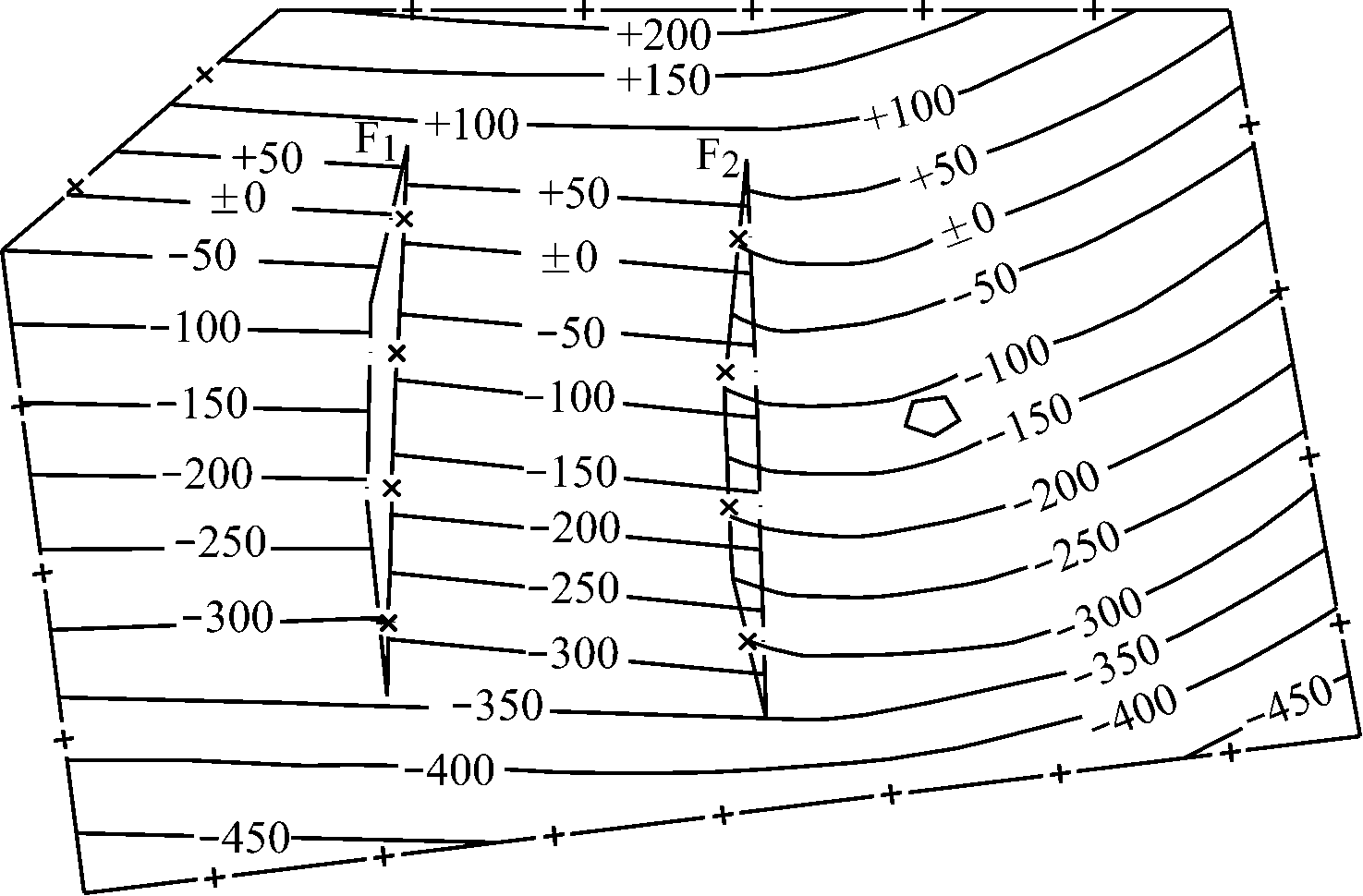 需要注意的是,在求解未知三角网顶点所对应的岩层面空间插值点时,空间插值单元邻近控制点的选取要根据其与岩层面空间插值点的连接关系来确定,若两者被正断层、逆断层或倒转褶皱中断,则该控制点将不予考虑。