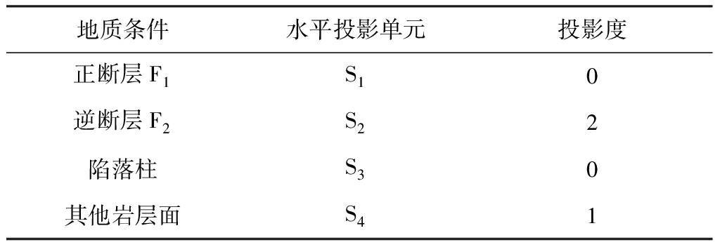 (1) 正断层和陷落柱在垂向上均无对应岩层面,其对应的水平投影单元为虚投影单元,且投影度为0。