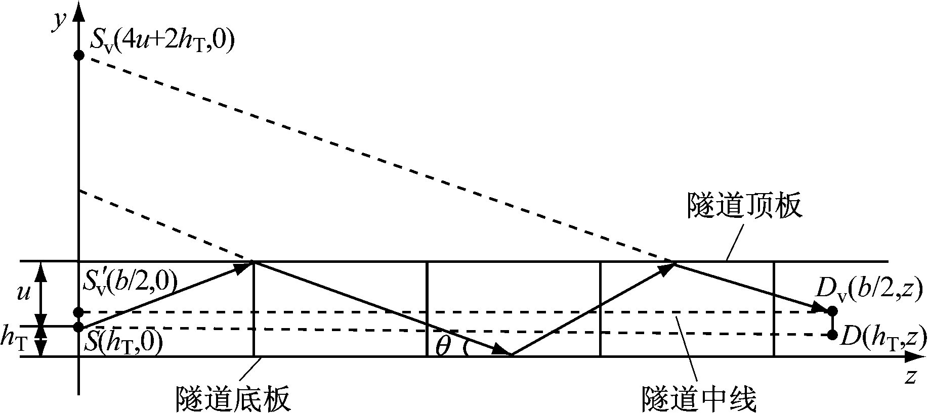 根据图2(b),由于锯齿螺旋射线经隧道顶底板来回反射,且传播路径所在平面平行于隧道侧壁,所以隧道可看作由顶底板构成的水平平板波导。假设矩形隧道的高度为b,发射天线和接收天线高度均为hT,发射天线和接收天线到隧道顶板的距离为u。利用镜像法建立锯齿螺旋射线在垂直展开面的镜像路径二维坐标系,如图3所示,其中Sv点为发射天线位置S点的镜像点