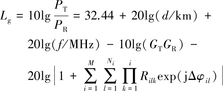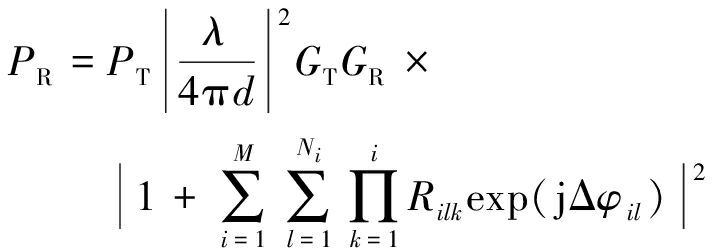 式中:PT为发射天线的发射功率;λ为电磁波波长;d为射线最短传播路径长度;GT和GR分别为发射天线增益和接收天线增益;M为传播路径的所有射线总反射次数;Ni为产生第i次反射的总路径数;Rilk为第i次反射的第l条路径经过k次反射的反射系数;Δφil为第i次反射的第l条路径与收发天线之间最短路径的相位差;f为电磁波频率。