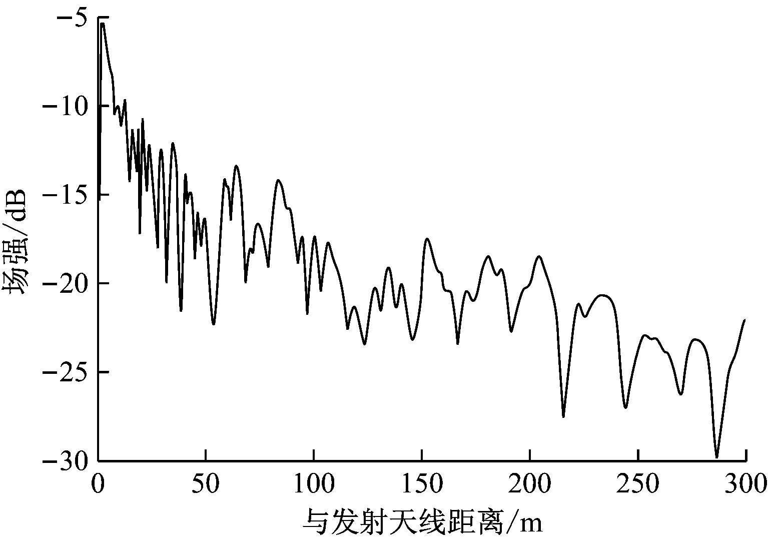 为验证所建立的多径信道模型的准确性,进行仿真测试。假设矩形隧道的宽×高为4 m×3 m,隧道顶底板和左右侧壁的相对介电常数为10,发射天线为各向辐射。根据式(2)中最后一项即多径信号合成项,对工作频率分别为900,1 800 MHz的电磁波场强分布进行仿真,结果分别如图4、图5所示。可看出UHF频段的电磁波在隧道中传播时会产生严重的多径衰落现象,尤其在靠近发射天线区域,呈现快衰落现象,并且随着工作频率的提高,快衰落现象严重,这与矿井隧道中电磁波传播特性相符。