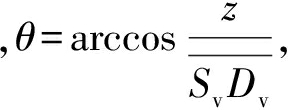 点为隧道中线与y轴的交点,Dv点为接收天线位置D点在隧道中线的垂直镜像点。根据镜像法可知,S点发出的锯齿螺旋射线经隧道顶底板3次反射后到达D点的传播路径长度,即垂直展开面上S点的镜像点Sv到D点的镜像点Dv的镜像路径长度