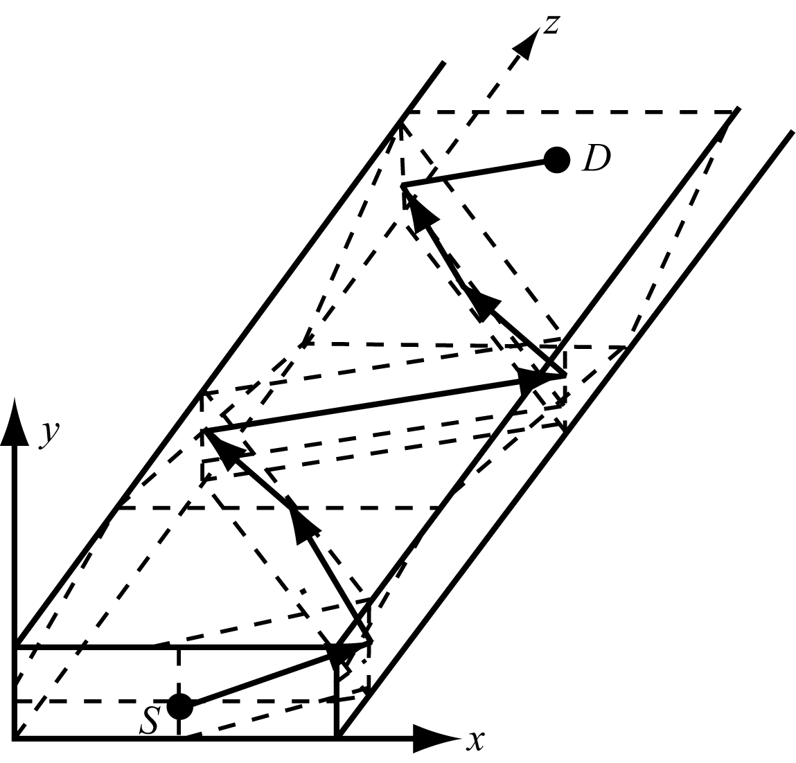 矩形隧道中经四壁反射的锯齿螺旋射线传播路径如图1所示,其中x轴和y轴分别表示矿井隧道的宽和高,z轴表示矿井隧道的走向(即电磁波传播方向)。射线从发射天线位置S点发出,在经过4个不同水平面及3个不同垂直面内反射(共7次反射)后,到达接收天线位置D点,可看出各反射段的传播路径并不在同一个平面,收发两端的总路径是一个三维路径。根据费马原理,一条射线从发射源经若干次反射到达接收端的路径一定是最短路径[11]。因此,将射线反射经过的各个不同面展开成二维平面时,得到该条射线在收发两端之间的最短连线。锯齿螺旋射线分别在水平展开面和垂直展开面的反射路径如图2所示,其中水平展开面和垂直展开面分别平行于矩形隧道的顶底板和两侧壁。