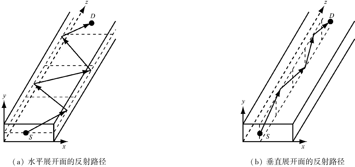 同理可求得锯齿螺旋射线在隧道水平展开面的传播路径长度。由此,锯齿螺旋射线的总传播路径长度计算可分别转换在水平平板波导和垂直平板波导中进行,不必要求收发天线与反射轨迹位于同一个水平面或垂直面上,天线位置可以任意。