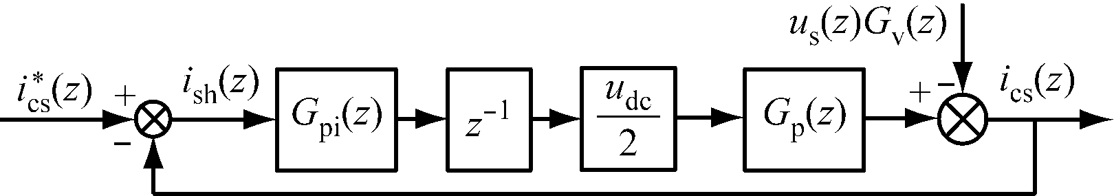 内环PI控制框图如图4所示。其中Gp(s)为SAPF系统等效控制对象,Gpi(s)为PI控制器传递函数,SPWM逆变器增益为udc/2。为了与实际数字控制效果更加接近,将图4所示的控制系统离散化,如图5所示。Gpi(z)为利用零阶保持器法离散后的z域的内环PI控制器。由于数字控制本身具有延迟特性,z-1代表数字实现的内在单位延迟。