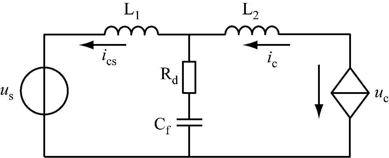 为简化分析,设电网三相对称无畸变,则SAPF每相独立,控制对象在单相等效电路推导。采用瞬时无功功率检测方法,从负载电流iL中提取谐波电流ish,并以电网电流is为反馈量进行闭环跟踪,将SAPF控制成流控电压源uc[11]。图1中,忽略Ls,将iL作为大电网并联非线性负载,其值只与电网电压有关,而与SAPF无关。不考虑iL扰动时[12],基于LCL型有源电力滤波器的单相等效电路如图2所示,其中uc,ic,ics分别为逆变器等效可控电压源、逆变器侧电流和网侧电流。