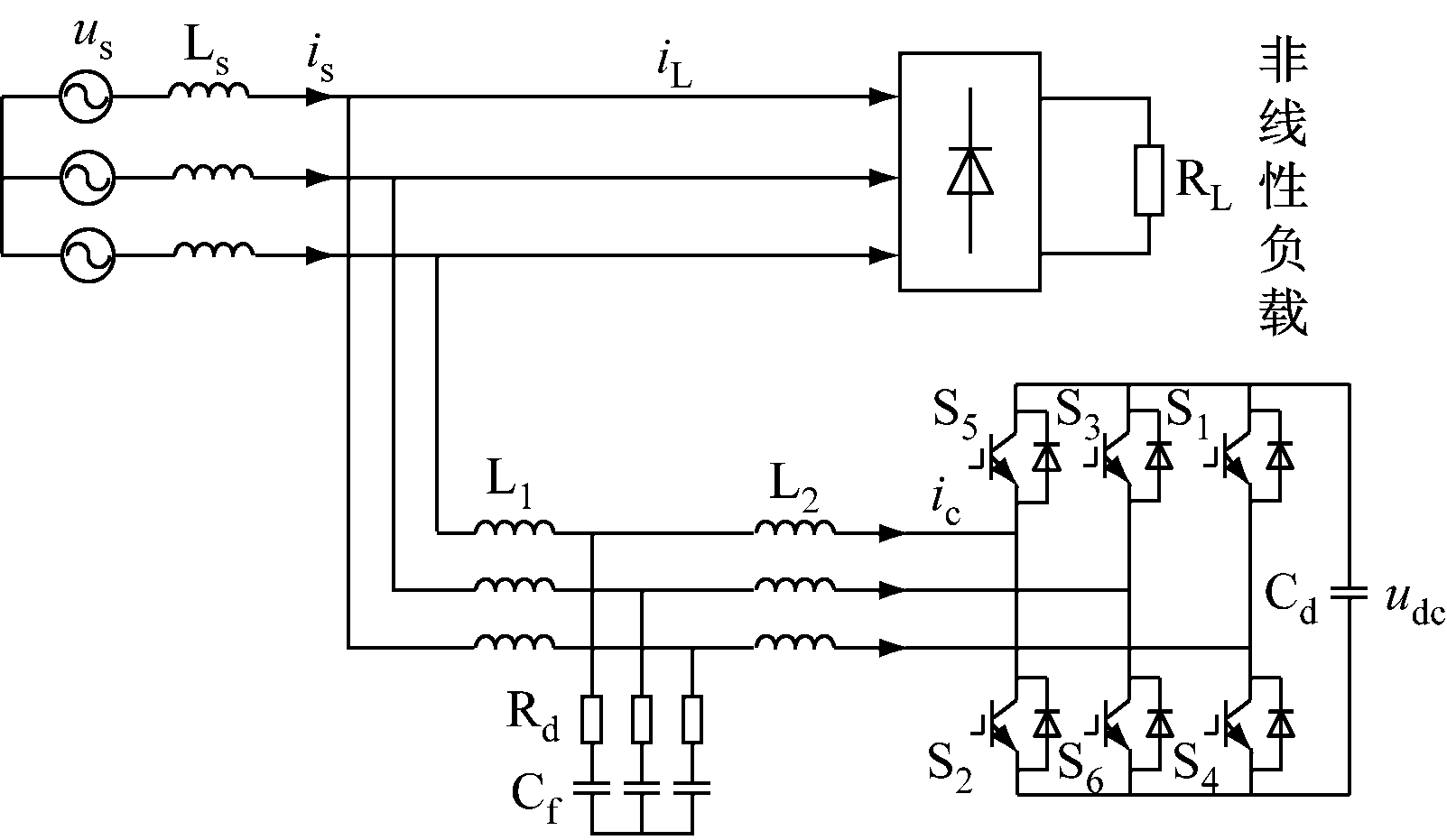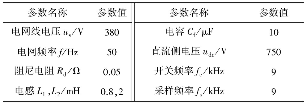 图1中,Ls为电网的等效电感;L1为电网侧电感;L2为逆变器侧电感;Rd为阻尼电阻;Cf为LCL型滤波器的滤波电容;Cd为直流侧储能电容;非线性负载为二极管整流负载;us为电网线电压;udc为直流侧电压;is,iL,ic分别为电网电流、非线性负载电流和SAPF输出电流。