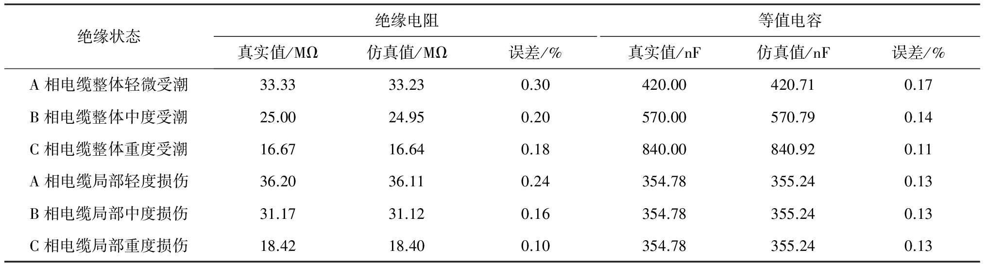 利用仿真模型模拟矿用高压电缆整体受潮和局部受损时不同程度的劣化状态,仿真结果见表1。