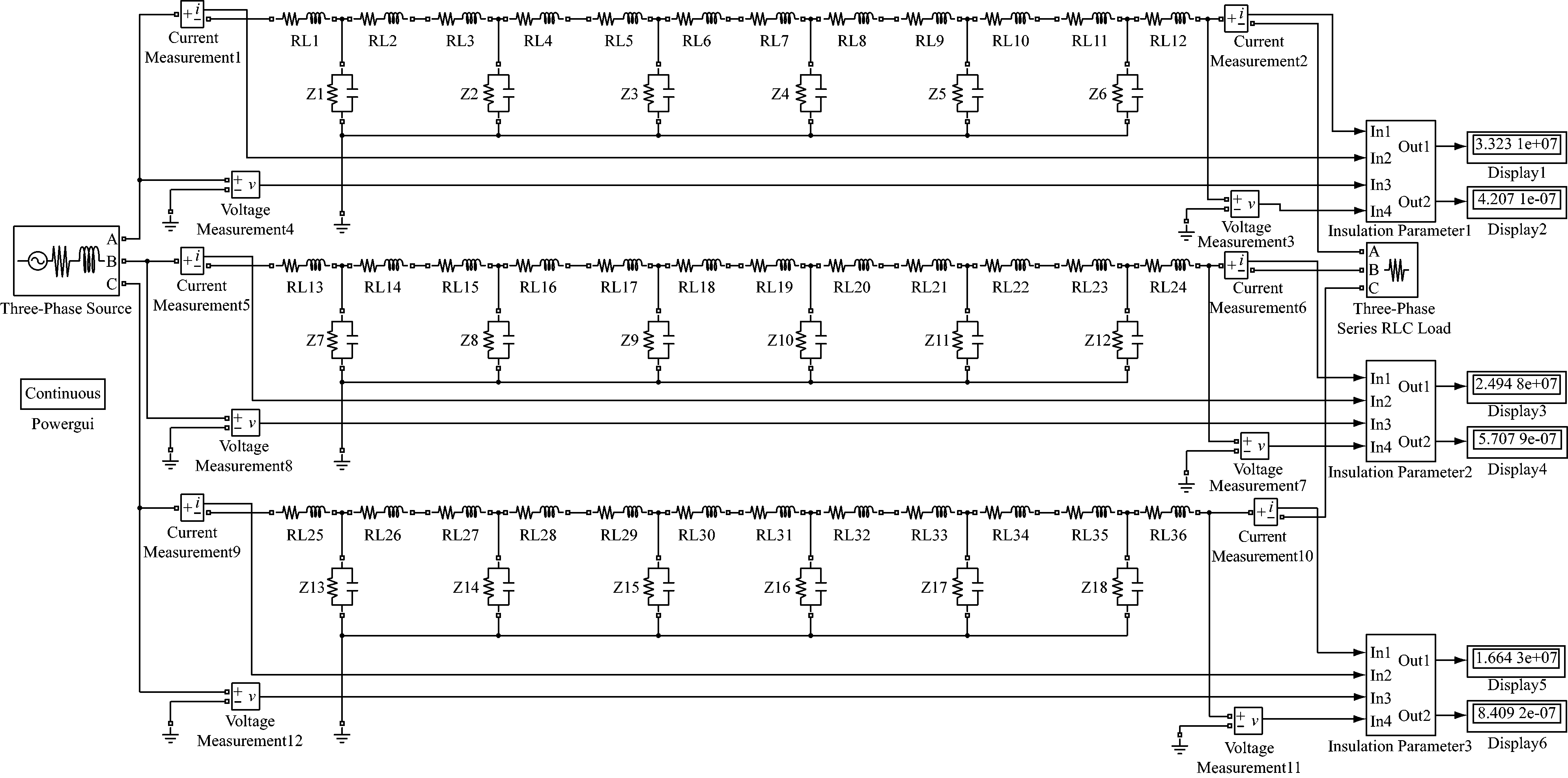 以型号为YJV-8.7/10 kV的交联聚乙烯绝缘聚氯乙烯护套的电缆绝缘劣化过程为研究对象,采用Matlab/Simulink建立矿用高压电缆绝缘在线监测仿真模型,如图3所示。电缆线路总长1.8 km,取每300 m电缆线路为一段,每段采用T参数模型。图3中,模块Z1—Z18为每段电缆绝缘电阻和等值电容的并联结构,模块RL1—RL36为每段电缆线芯等效电阻和等效电感的串联结构,模块Three-Phase Source为煤矿供电系统的三相电压源,模块Three-Phase Series RLC Load为电阻负载,电缆绝缘劣化的分析、计算过程封装在Insulation Parameter模块中。仿真模型参数由电缆结构参数计算得出:电缆线芯单位长度等效电阻r0=3.28×10-5 Ω/m,电缆线芯单位长度等效电感l0=2.138×10-7 H/m,电缆单位长度绝缘电导g0=1.397×10-11 S/m,电缆单位长度等值电容c0=1.971×10-10 F/m。经计算得出每段电缆线芯等效电阻为9.84 MΩ,每段电缆线芯等效电感为64.14 μH,每段电缆绝缘电阻为238.61 MΩ,每段电缆等值电容为59.13 nF。