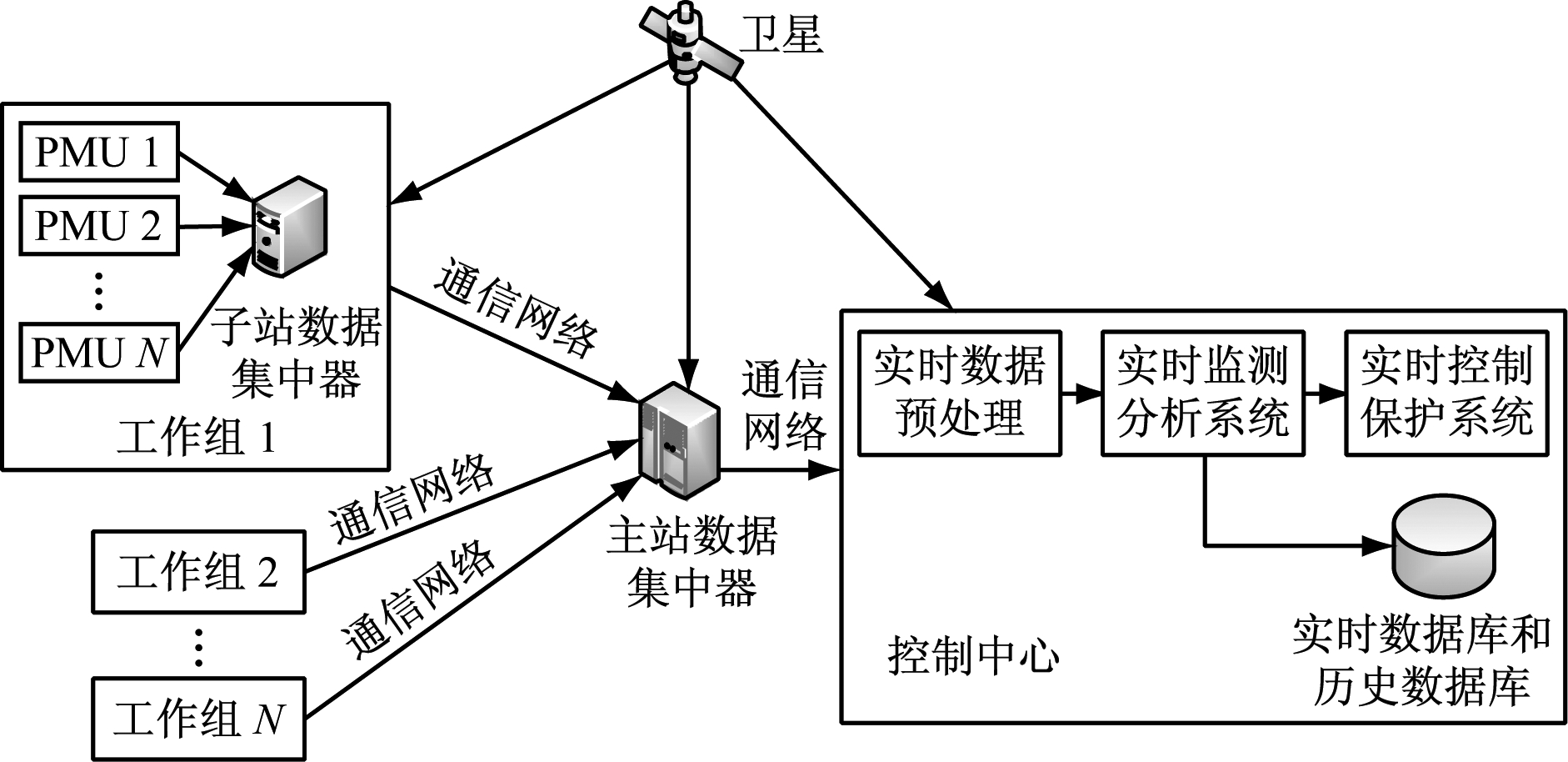 基于WAMS的矿用高压电缆绝缘在线监测系统架构如图1所示,主要由4个单元组成:① GPS单元。由卫星提供全网系统的同步时钟信号,是建立同步时间系统的基础。② 相量测量单元(Phasor Measurement Unit,PMU)。PMU同步采集实时电压、电流数据并上传至子站数据集中器,再通过主站数据集中器记录数据并传输至控制中心。③ 通信网络。通过光纤建立数据传输通道,实现全网数据互联。④ 控制中心。汇总各处PMU传输的数据并在线分析,及时形成保护和控制策略,是系统的核心。