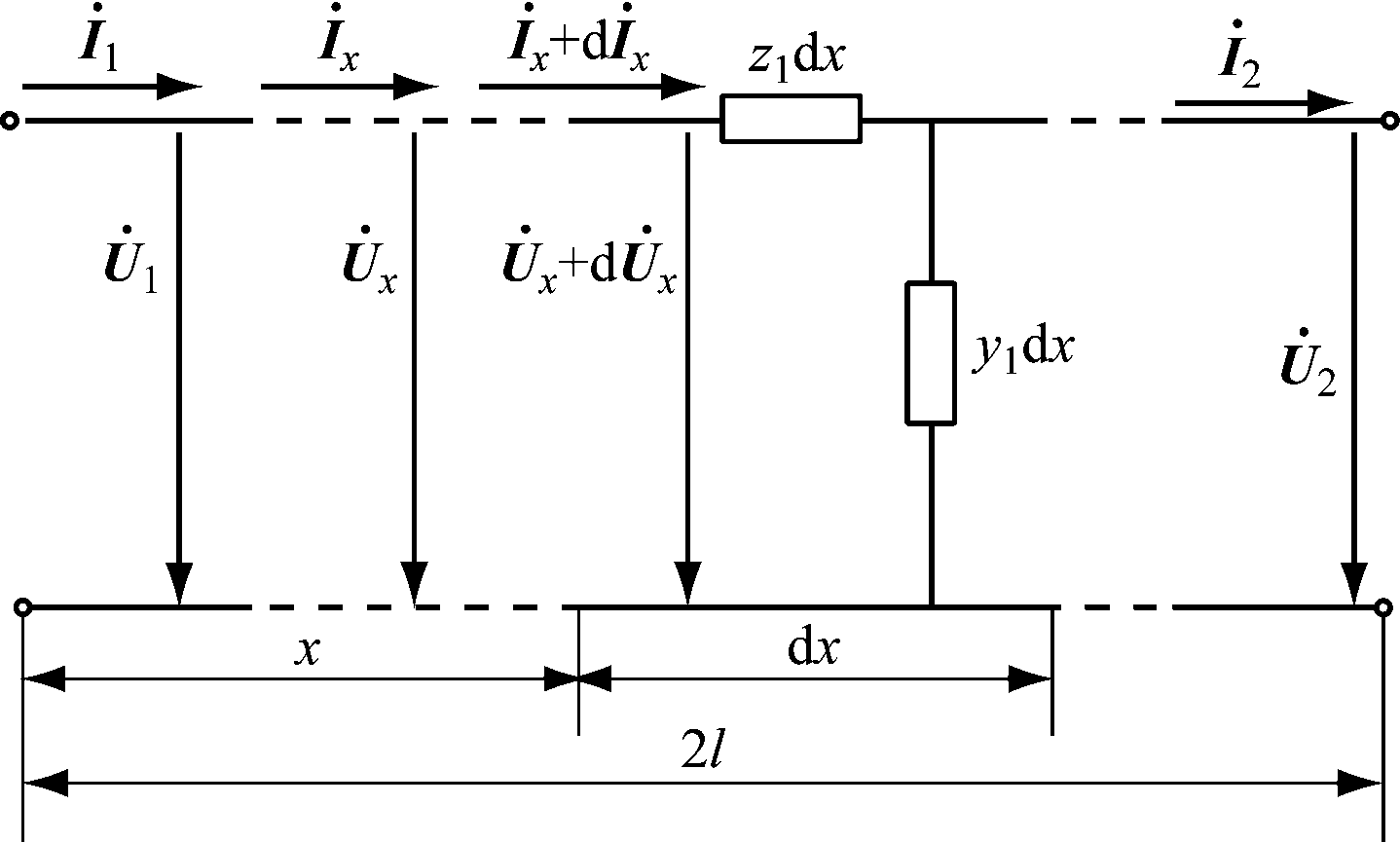 ;电缆线路长度为2l。取dx为长度微元,距电缆线路首端长度为x+dx处的电压为
