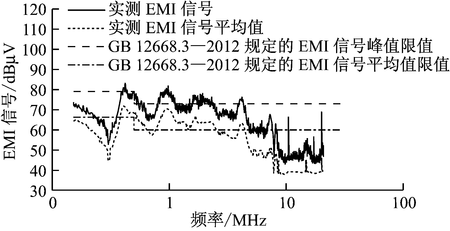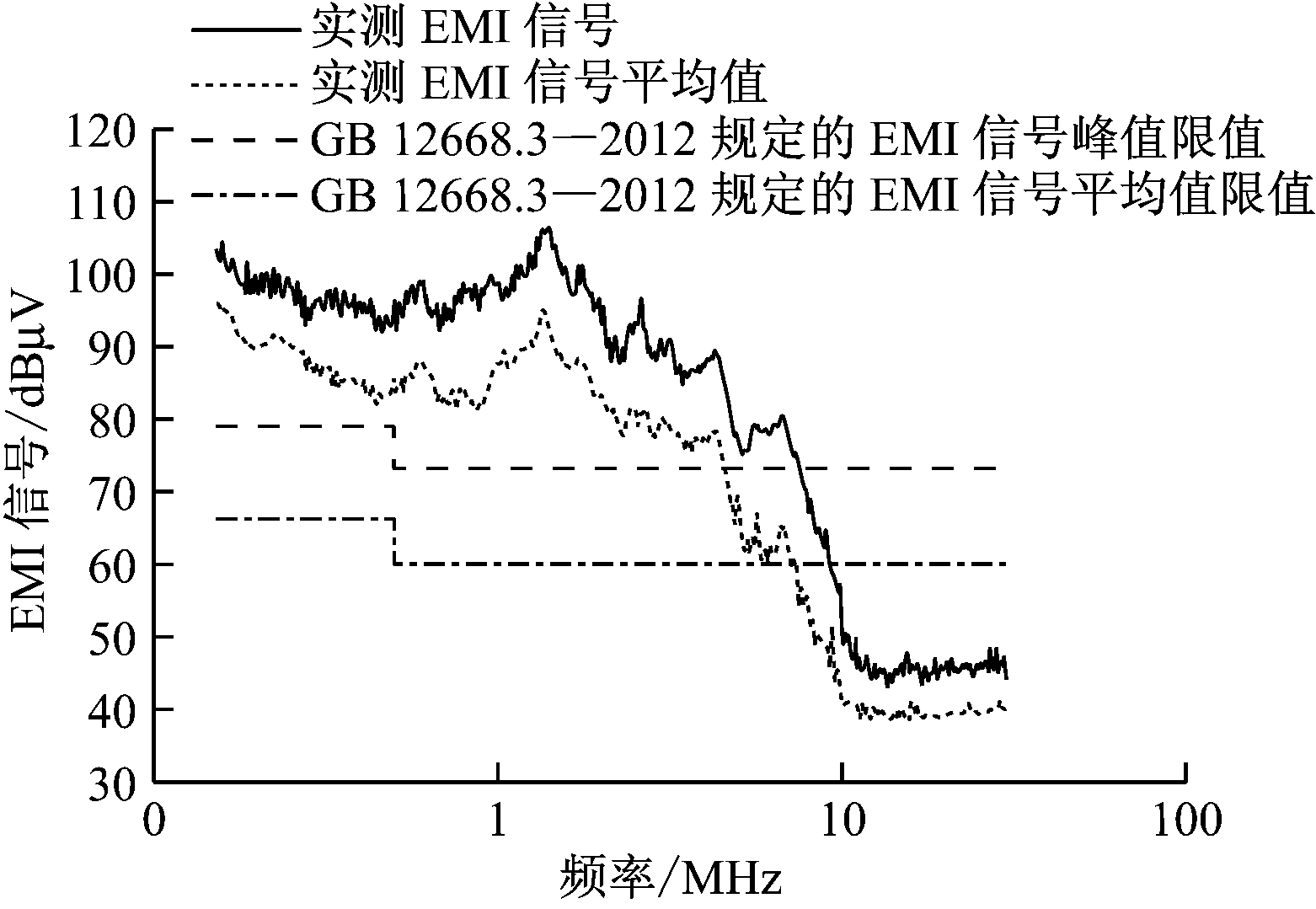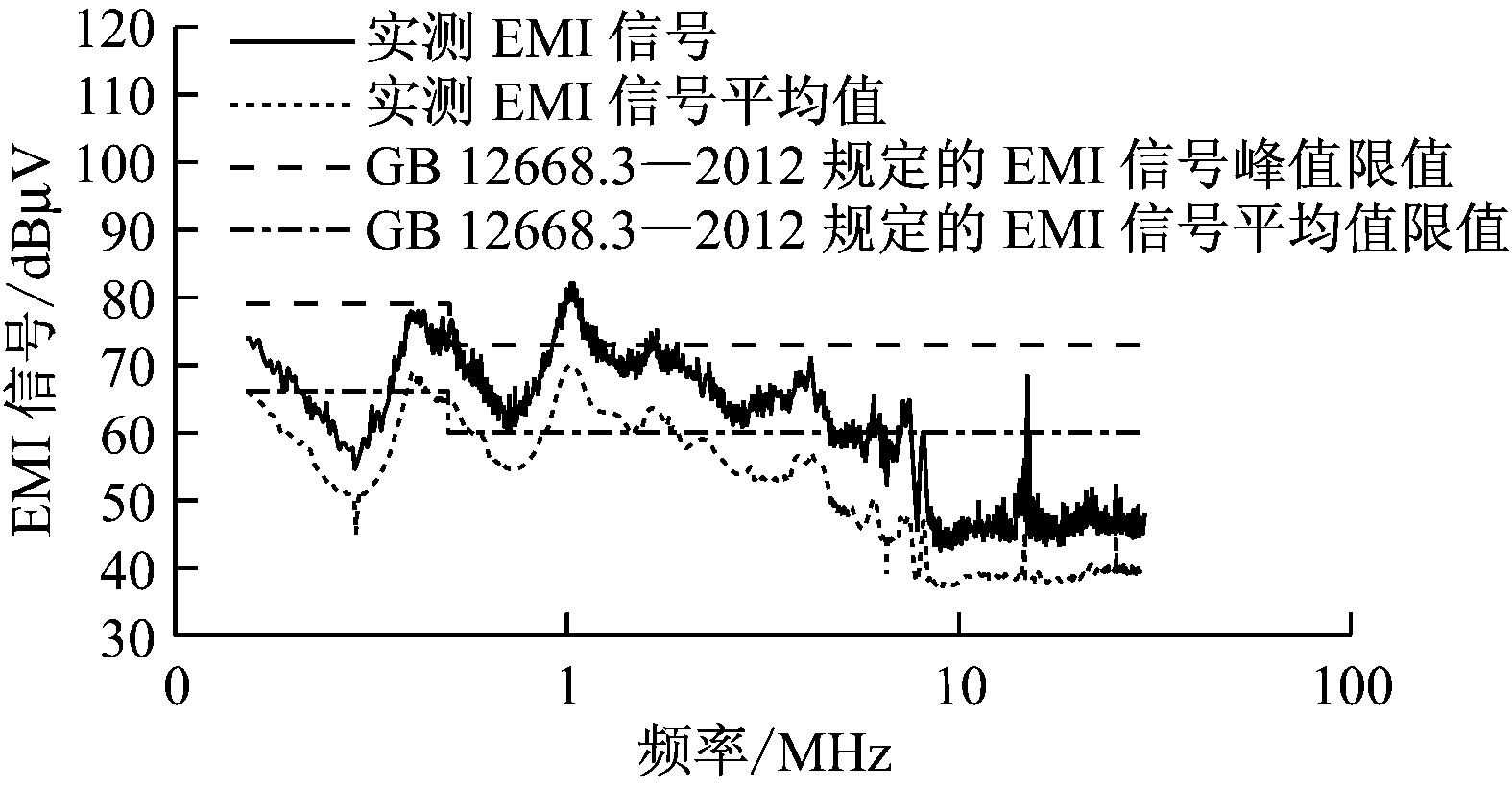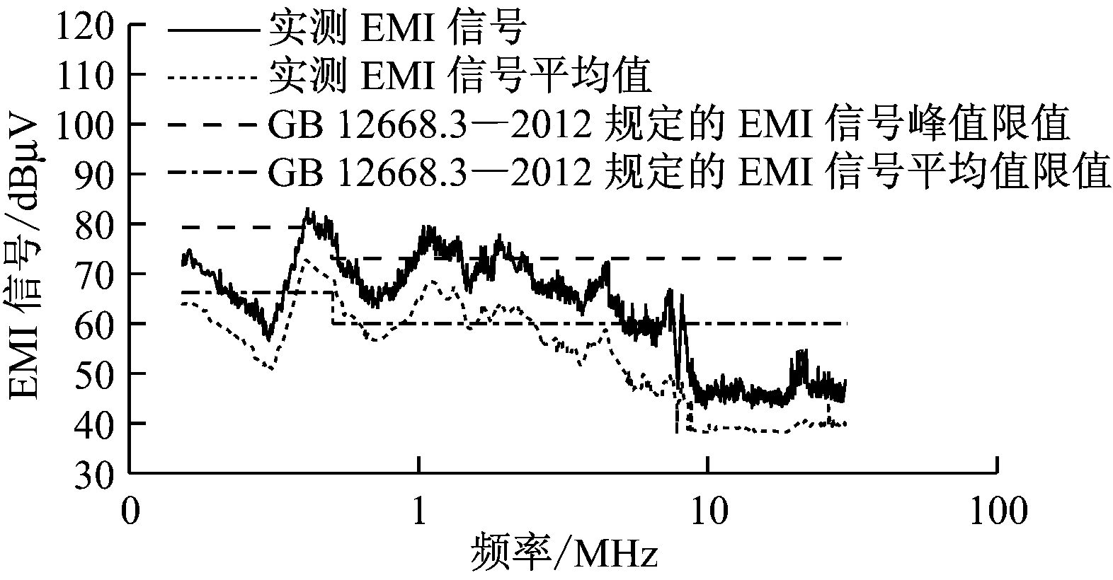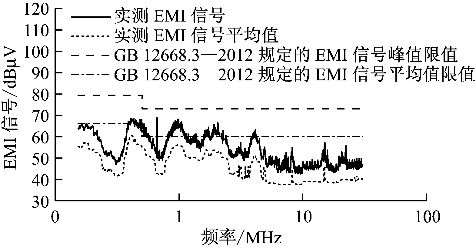 图4为防爆变频器产生的EMI信号。可看出实测EMI信号超出GB 12668.3—2012规定的标准限值约40 dB。