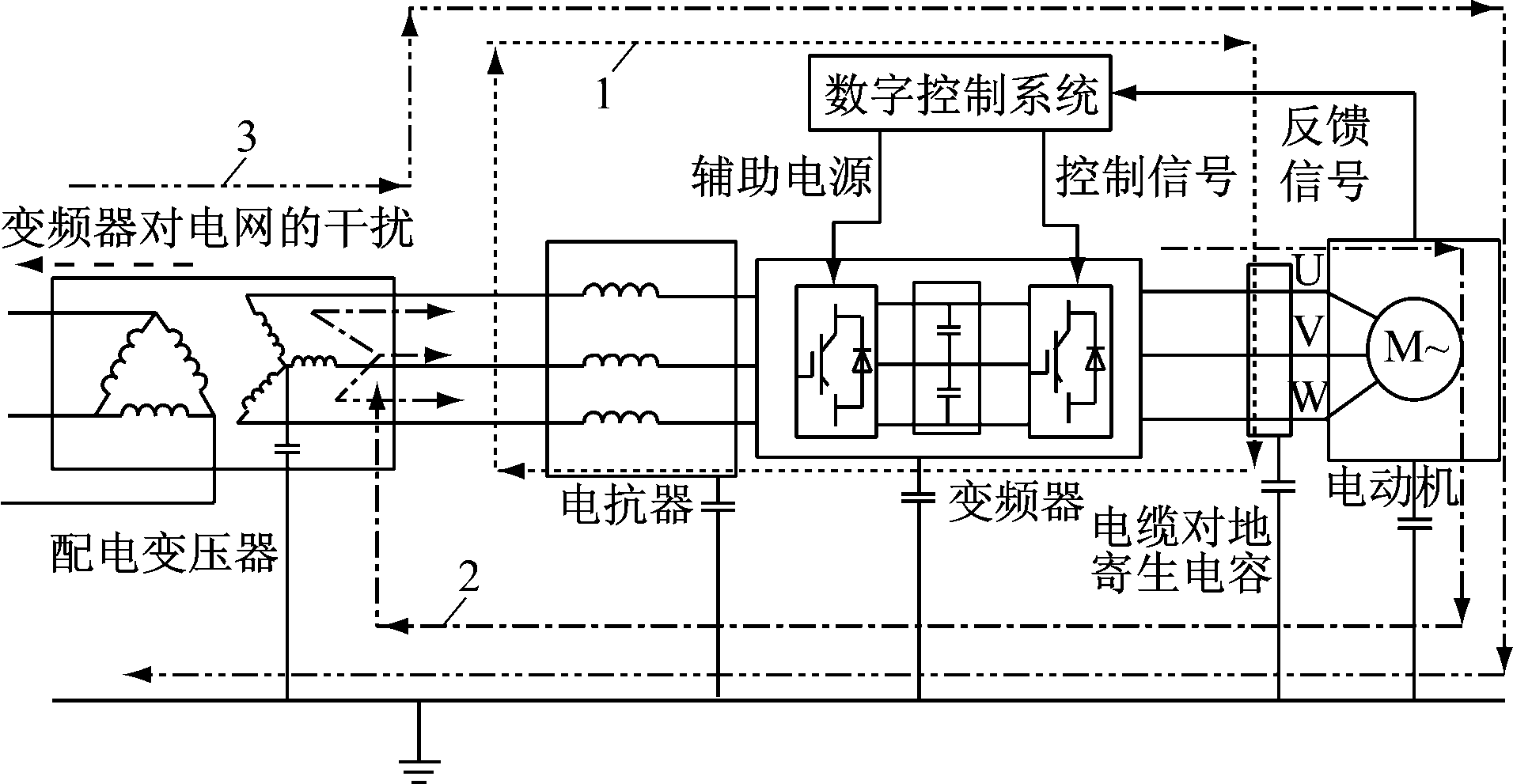 (1) IGBT开关暂态过程中的di/dt与变频器中的母排和滤波电容的寄生电感形成差模噪声,如图1中路径1所示。