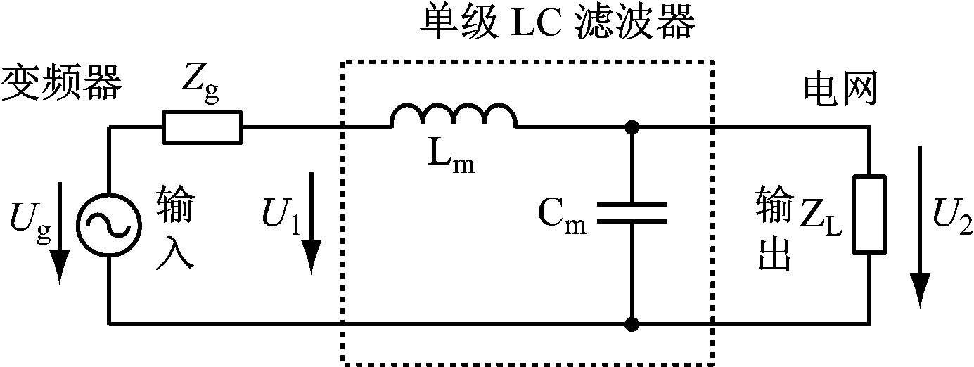 设计EMI滤波器时,将电网侧作为负载,变频器作为干扰源。设Ug为干扰源电压,U1为未经EMI滤波器衰减的噪声电压,U2为返回电网的噪声电压,Zg为源阻抗, ZL为负载阻抗。若Zg=ZL,得到基于单级LC滤波器的EMI滤波器结构,如图2所示。