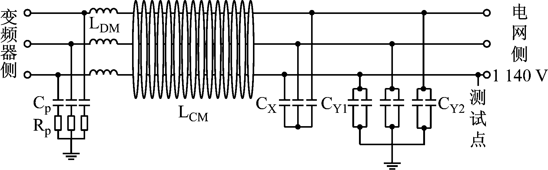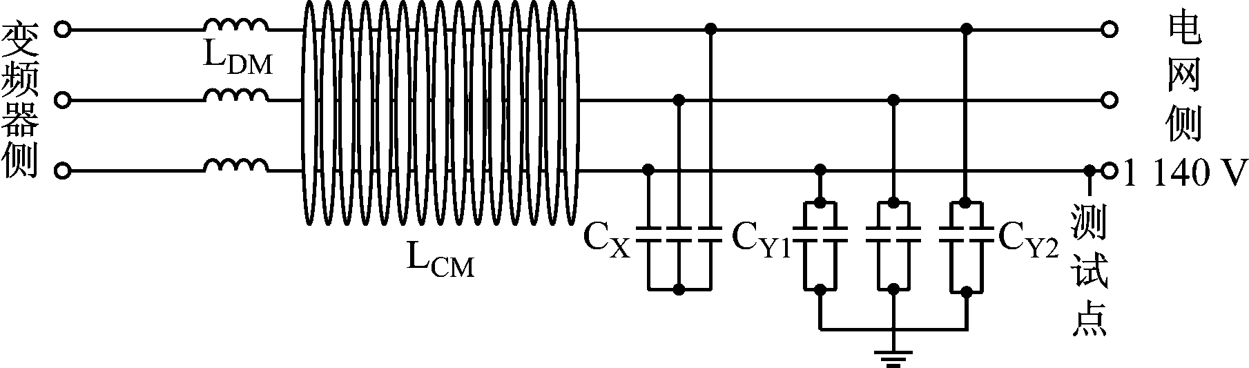 防爆变频器产生的EMI信号一般比GB 12668.3—2012《调速电气传动系统 第3部分:电磁兼容性要求及其特定的试验方法》规定值高30~40 dB,在0.15~30 MHz频段,差模、共模信号共存。由于大功率防爆变频器电压、电流较大时,一般采用高压探头的方法测量EMI,很难分离差模和共模信号,加上阻抗不匹配等不良因素的影响,使得滤波器的设计具有一定难度。本文设计了一种大功率防爆变频器EMI滤波器,其基于单级LC滤波器,且在变频器阻抗不匹配时采用“P”型匹配网络来抑制EMI信号。