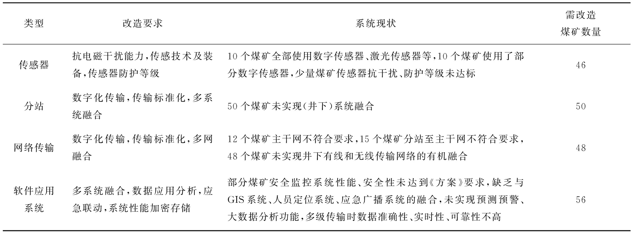 目前神华集团煤矿安全监控系统符合《方案》各技术要求的占比见表1。可看出神华集团各煤矿安全监控系统软硬件现状与《方案》要求差距较大,没有一套系统能完全达到《方案》要求,均需进行升级改造。传输数字化方面,有36套系统的传感器与分站未使用数字传输,10套系统部分使用数字传输,仅有10套系统实现了数字传输;传感技术及装备方面,仅有少量系统使用了部分激光传感器、多参数型传感器、红外传感器,没有系统使用自诊断型传感器、无线传感器;支持多网、多系统融合方面,《方案》要求融合GIS系统,至少井上融合应急广播系统、人员定位系统,推荐井下融合,目前仅锦界煤矿、郭家湾煤矿、青龙寺煤矿等实施的安全监控系统实现了地面融合,没有实现井下融合;格式规范化方面,《方案》要求分站至主干网采用以太网传输,目前有13个煤矿还没有采用以太网,未实现数字化传输,仅有14个煤矿的安全监控系统中分站至主干网采用以太网传输;数据应用分析方面,部分系统实现了伪数据标注及异常数据分析,没有系统实现预测及大数据分析;应急联动方面,有11个煤矿的安全监控系统实现了与人员定位系统联动,未实现与应急广播系统、通信系统联动。