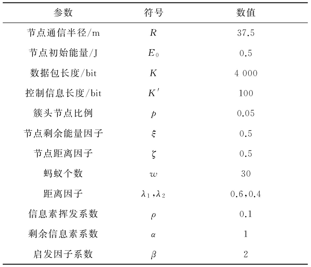 EDACR算法与传统的蚁群算法相比,不仅考虑了下一跳节点的剩余能量,还考虑了当前节点到下一跳节点、下一跳节点到Sink节点的距离,并且用距离因子λ1,λ2来约束节点C′与节点Cj、节点Cj与Sink节点间的通信距离。适当设置λ1,λ2能够进一步对全局路径进行优化。
