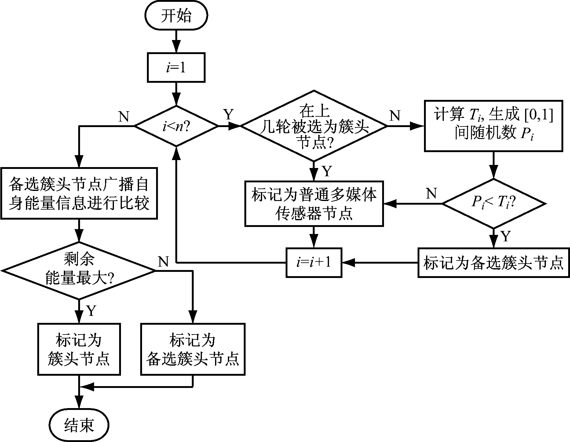 在选取簇头节点时,节点S1,S2,…,Sn各自产生1个[0,1]间的随机数P1,P2,…,Pn,并根据式(4)计算阈值Ti。将Pi比各自Ti小的节点作为该虚拟网格内备选簇头节点,记为C1,C2,…,Cm(m为备选簇头节点数)。节点C1,C2,…,Cm在该虚拟网格内宣布自己成为备选簇头节点,之后以广播的方式向该虚拟网格内节点发送自己的能量信息、ID标志和位置信息。各备选簇头节点将自身的能量信息与接收到的其他备选簇头节点的能量信息进行比较,若自身能量小于其他备选簇头节点的能量,则自身依然作为备选簇头节点。经过一轮比较后,最终确定剩余能量最多的一个备选簇头节点为该虚拟网格内本轮的簇头节点,记为Cmax。Cmax将确定的簇头身份、位置信息、能量信息广播至虚拟网格内其他节点。其余Pi比各自Ti小的节点作为下一轮的备选簇头节点,记为C1,C2,…,Cm-1,并按照剩余能量大小编制备选ID,作为簇头节点能量消耗至自身能量70%时的备用选项。Pi比各自Ti大的节点作为该虚拟网格内普通多媒体传感器节点,记为S1,S2,…,Sn-m,与簇头节点进行数据传输。