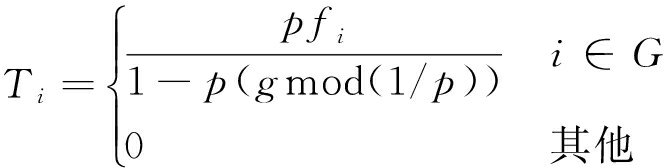 从式(3)可看出,权值fi由2个部分组成:第1部分考虑了平均能量因素,使能量消耗低的节点成为簇头节点的概率增大;第2部分表示网络的均衡度,使与所有其余节点间距离小的节点成为簇头节点的概率增大。因此,传统LEACH算法中的阈值公式[11]可修改为