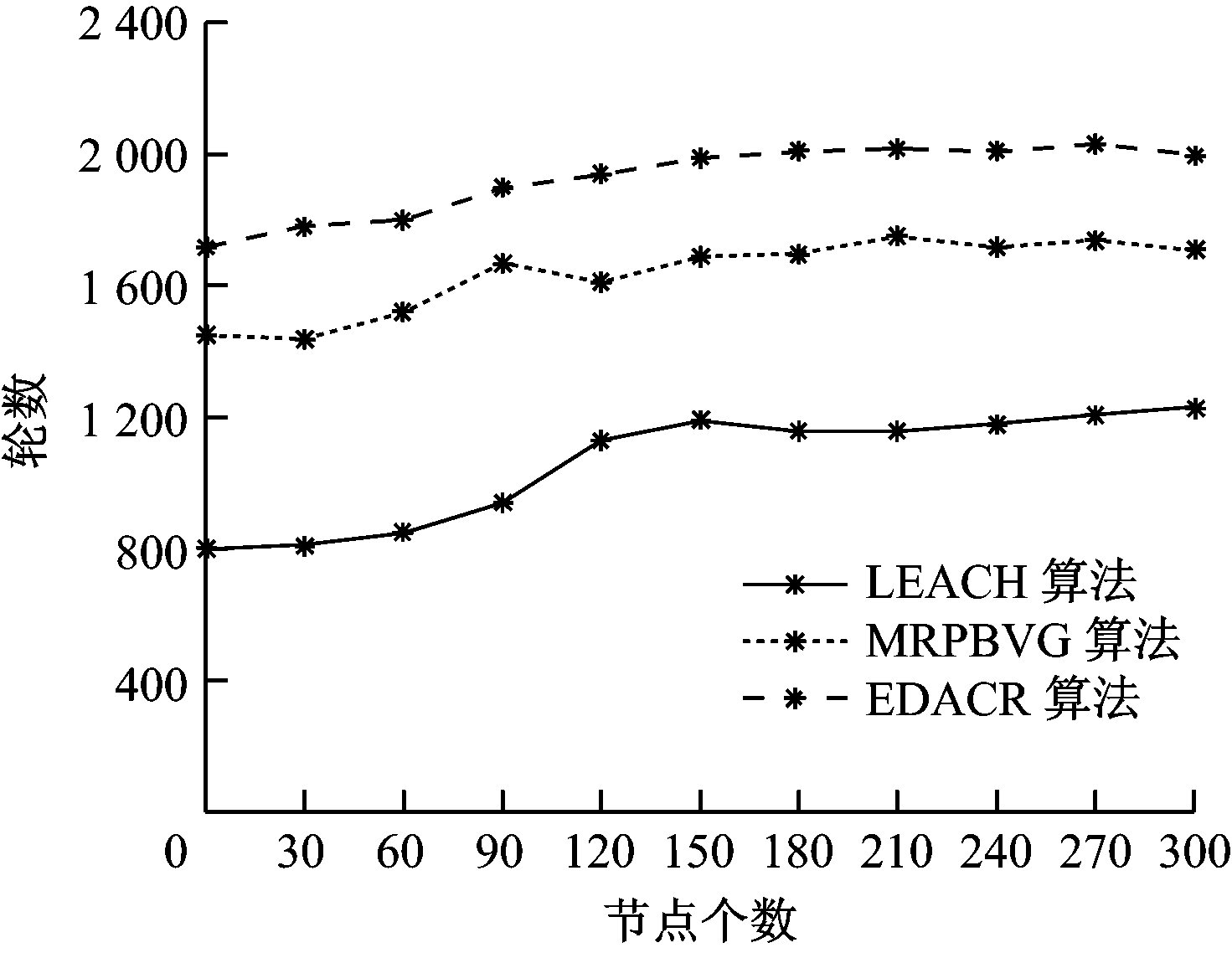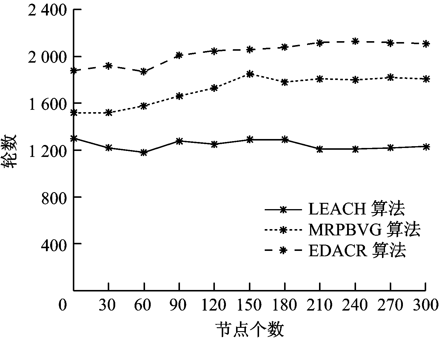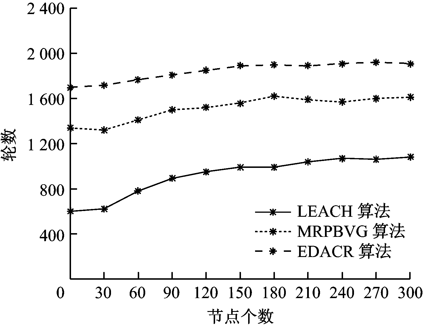 设置煤矿WMSN中节点个数以30为步长增至300,每种情况重复50次实验。分别采用经典LEACH算法、文献[12]提出的矿井巷道层次性路由协议——MRPBVG算法及本文所提EDACR算法对煤矿WMSN数据进行传输,测试网络中出现节点“死亡”的平均轮数,结果如图7所示。可看出在节点数相同的情况下,采用EDACR算法时煤矿WMSN中节点存活的轮数最多。从图7(c)可以看出, EDACR算法减少了网络中“死亡”节点数目,当节点个数为240时, EDACR算法相较于LEACH算法延长网络生命周期约900轮,相较于MRPBVG算法延长网络生命周期约400轮。