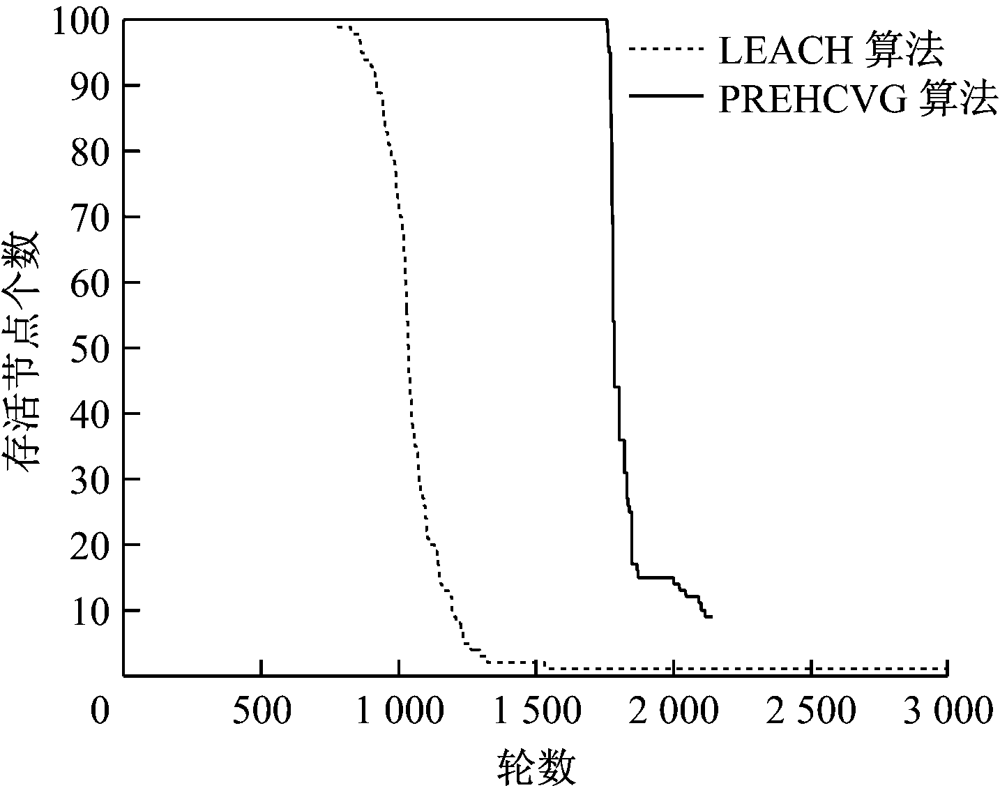 LEACH算法进行节点分簇时,网络生命周期如图5所示。可看出随着轮数增加,网络中存活的节点逐渐减少。采用LEACH算法时,当轮数达到约770时,煤矿WMSN存活的节点数开始减少;而采用PREHCVG算法时,存活节点在轮数达到约1 780时才开始减少,可见PREHCVG算法降低了网络中存活节点减少的轮数。
