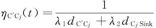 式中:λ1,λ2为距离因子;dC′Cj,dCjSink分别为节点C′与节点Cj、节点Cj与Sink节点间的通信距离。