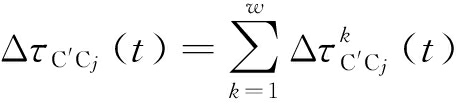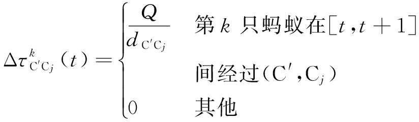 为[t,t+1]内第k只蚂蚁在(C′,Cj)路径上的累加信息素;Q为常量,表示完成任务后在经过的路径上所释放的信息素总量。