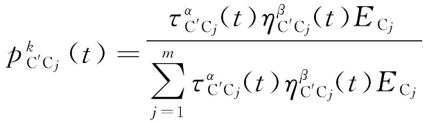 式中:τC′Cj(t)为t时刻上一虚拟网格内路由节点C′与所考虑虚拟网格内备选簇头节点Cj(j=1,2,…,m)之间路径上的剩余信息素;α为剩余信息素系数;ηC′Cj(t)为t时刻节点C′与节点Cj的启发因子;β为启发因子系数;ECj为节点Cj当前剩余能量。