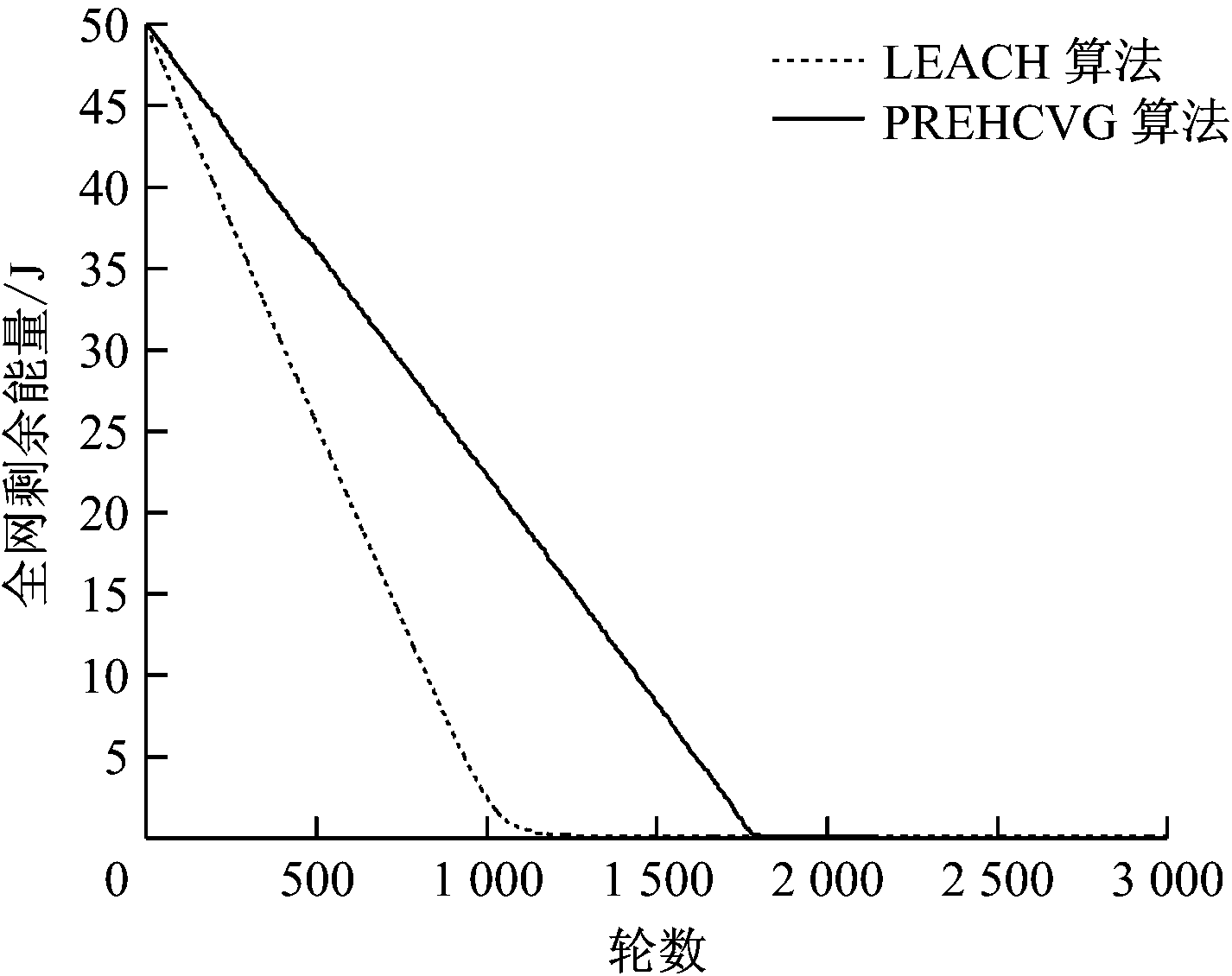 煤矿WMSN采用PREHCVG算法与经典LEACH算法进行节点分簇时,全网剩余能量如图6所示。可看出采用PREHCVG算法时,煤矿WMSN全网剩余能量曲线较采用LEACH算法时斜率低,即采用PREHCVG算法时全网能量消耗更加平均,算法作用时间更持久。对照图5可知,采用LEACH算法时,在约1 200轮后WMSN全网节点能量耗尽,而采用PREHCVG算法时在1 870轮左右全网节点能量耗尽。