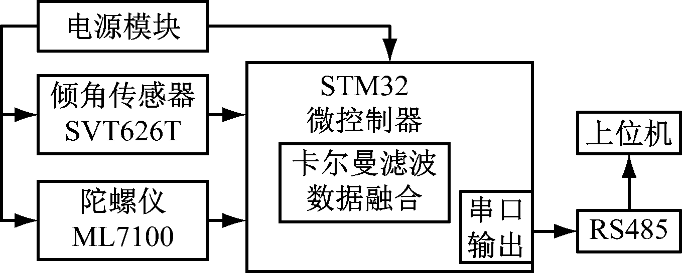 姿态角度测量系统由倾角传感器、陀螺仪等组成,如图2所示,陀螺仪和倾角传感器数据信号通过串口送入STM32微控制器中,通过卡尔曼滤波器对二者数据进行融合,不断递归运算,获得准确的姿态角度信息,然后通过输出串口转RS485接口,上传到上位机进行处理和显示。