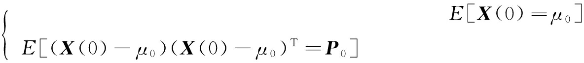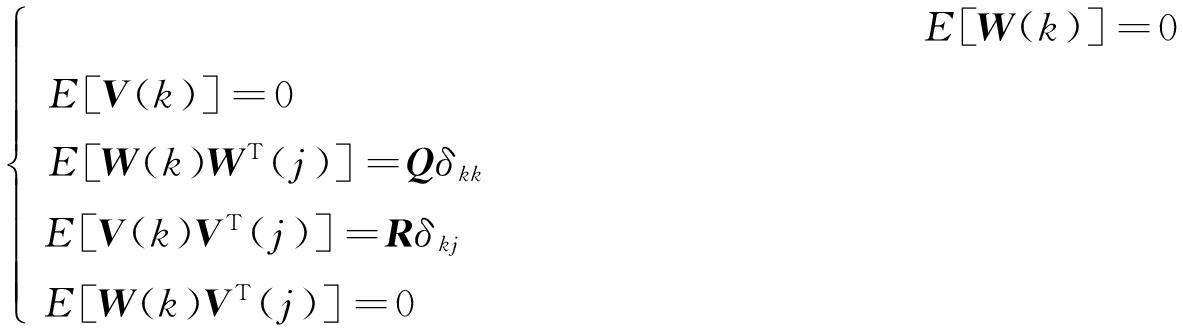 式中:E[W(k)]表示系统过程噪声均值;E[V(k)]表示系统量测噪声均值;E[W(k)WT(j)]表示过程噪声方差;E[V(k)VT(j)]表示量测噪声方差;E[W(k)VT(j)]表示过程噪声和量测噪声的协方差;Q为过程噪声协方差;R为观测噪声协方差;δkk=1;δkj=0;μ0为状态初始值;P0为协方差初始值。